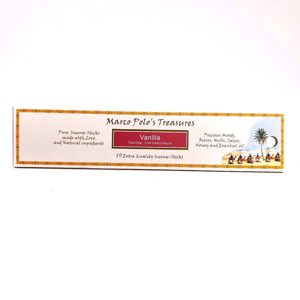 Bețișoarele parfumate Vanilla, de la Marco's Polo Treasures, pentru fumigații, sunt realizate din ingrdiente naturale. Aceste bețișoare parfumate sunt realizate manual, in India, fără compromisuri, din ingrediente naturale controlate si aprobate ECOCERT. Astfel, bețele parfumate naturale Vanilla sunt bețișoare pentru fumigații de calitate superioara ce au în compoziție pulberi de vanilie si cardamon. Aceste arome naturale au efect tonic asupra sistemului nervos, relaxant, contribuind la creșterea bunăstării emoționale și libidoului.