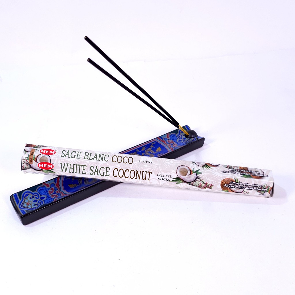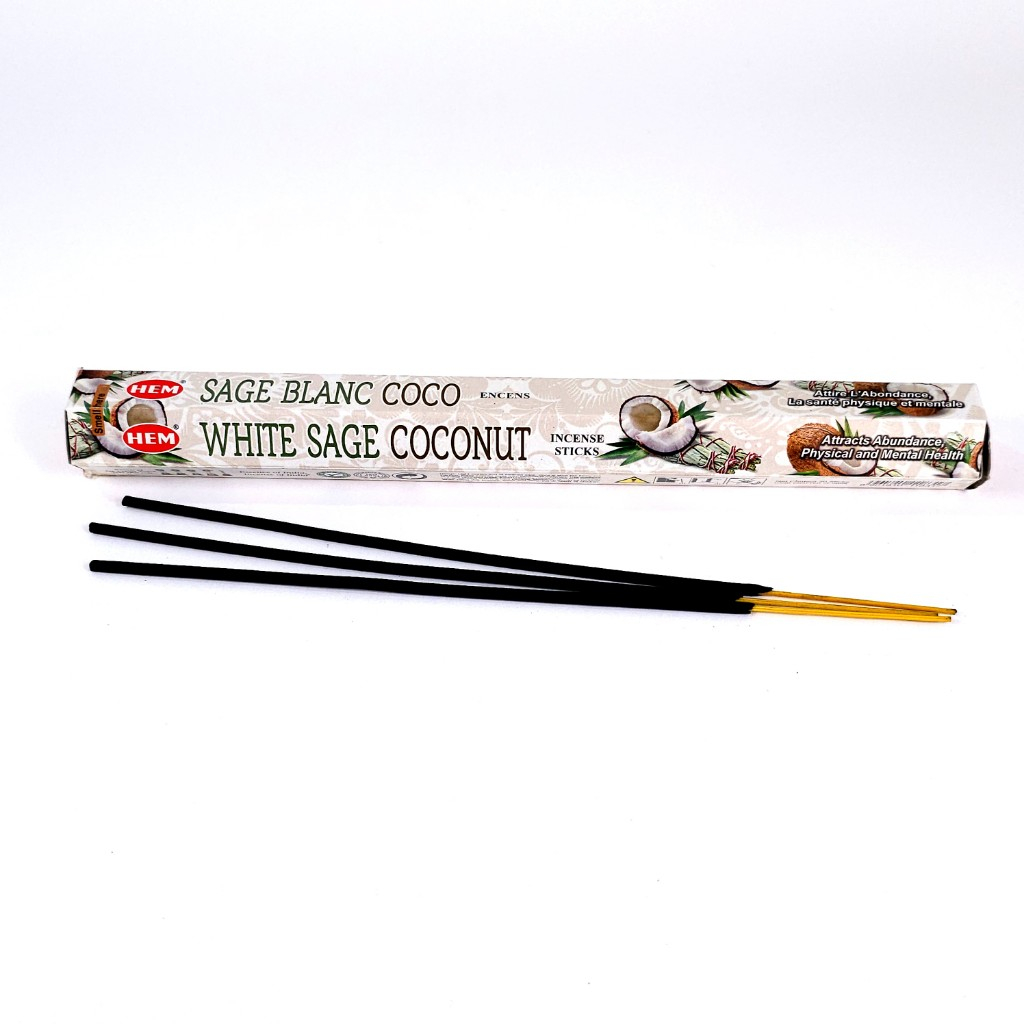 Bețișoare parfumate White Sage Coconut marca Hem. Bețe parfumate pentru ars cu arome plăcute, revigorante de salvie albă și cocos.