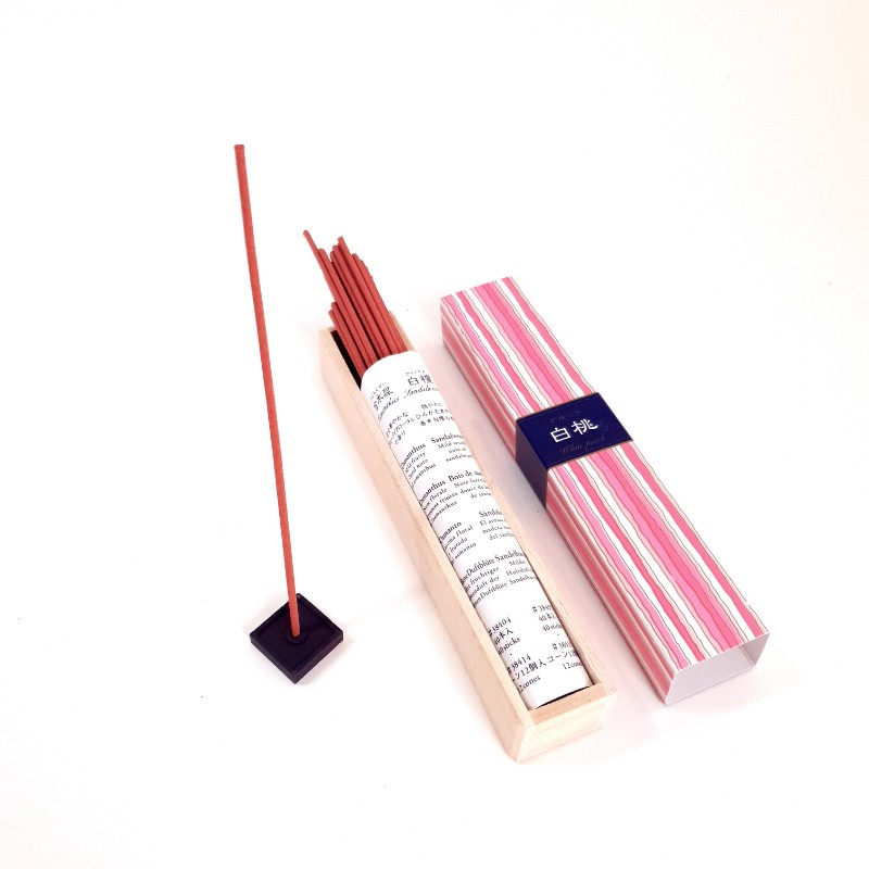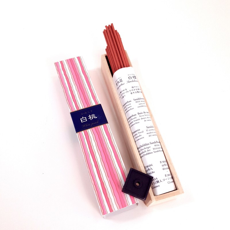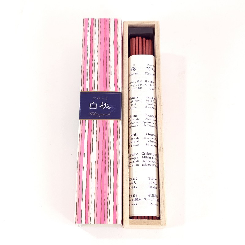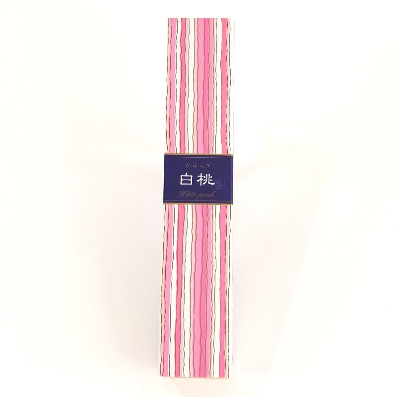 Bețișoare parfumate japoneze White Peach, produse de Nippon Kodo, din gama premium Kayuragi, cu arome de piersică