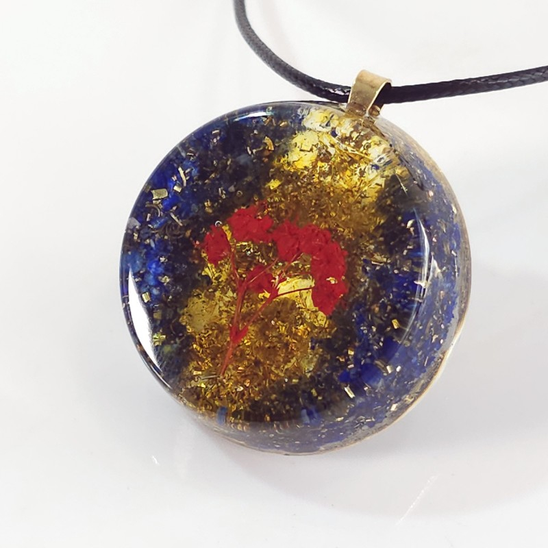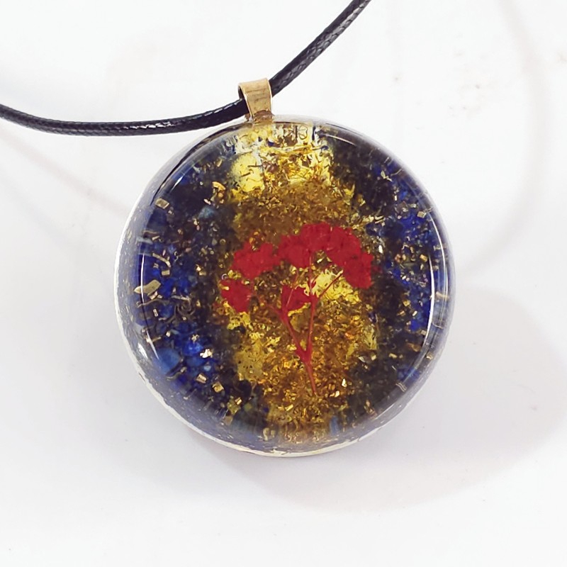 Pandantivul este realizat din pietre naturale semiprețioase de lapis lazuli, citrin și cuarț turmalinat, alături de alamă, rășină și o floare naturală colorată, simbol al armoniei şi virtuţilor spiritului.