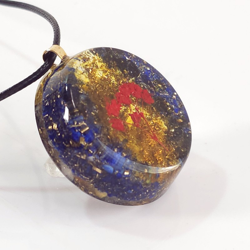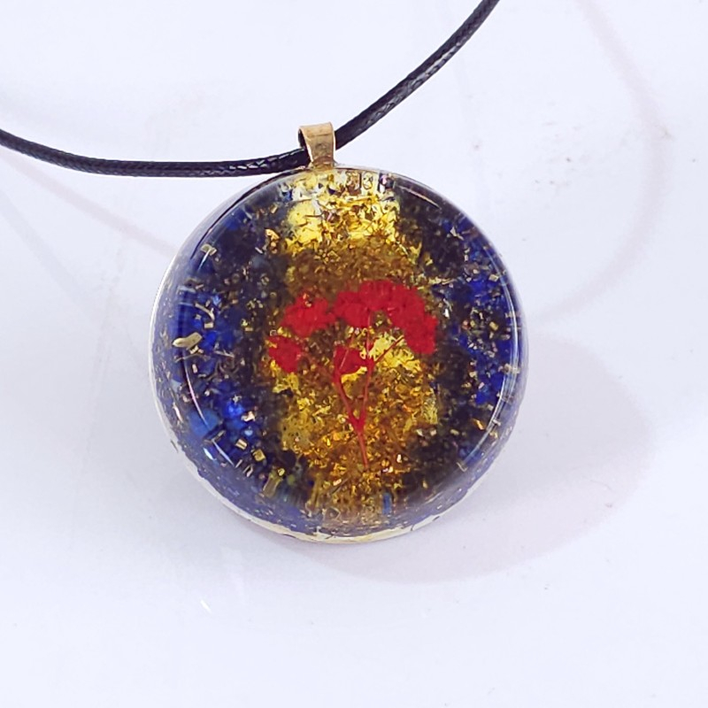Pandantivul cu floare de câmp în rășină are agățătoare placată cu aur și dispune de un snur negru din bumbac cerat cu lungimea de 90 cm si grosimea de 2 mm.