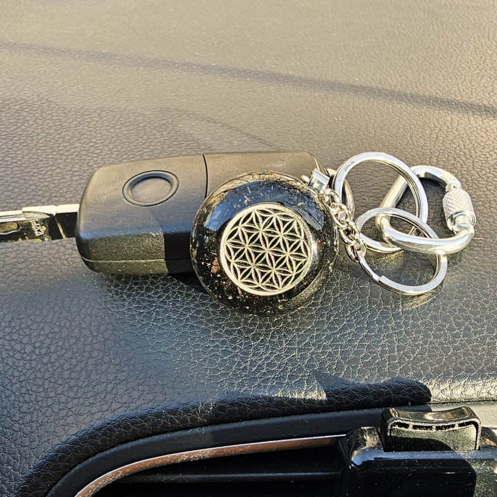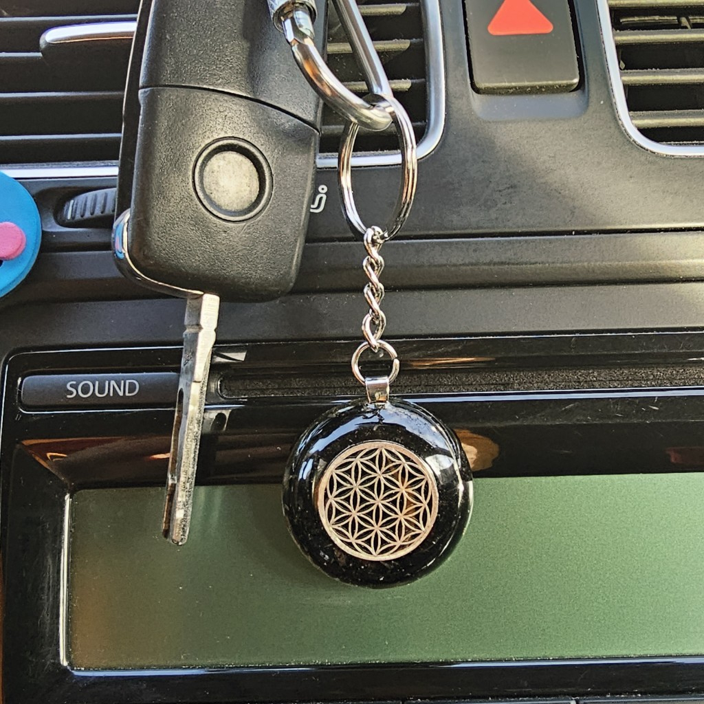 Breloc orgonic din pietre naturale de turmalină neagră, onix, obsidian, serafinit, labradorit, ametist, alamă, model central argintiu reprezentând Floarea Vieții, un puternic simbolul al geometriei sacre, întâlnit din cele mai vechi timpuri în diferite culturi din întreaga lume. Acest simbol reprezintă expresia vizuala a matricei vieții, a planului divin și armoniei depline.