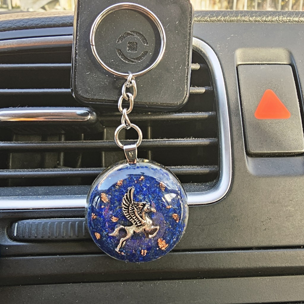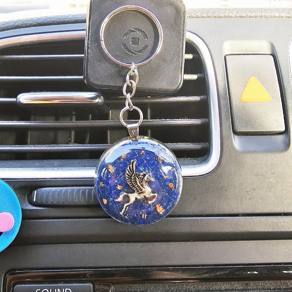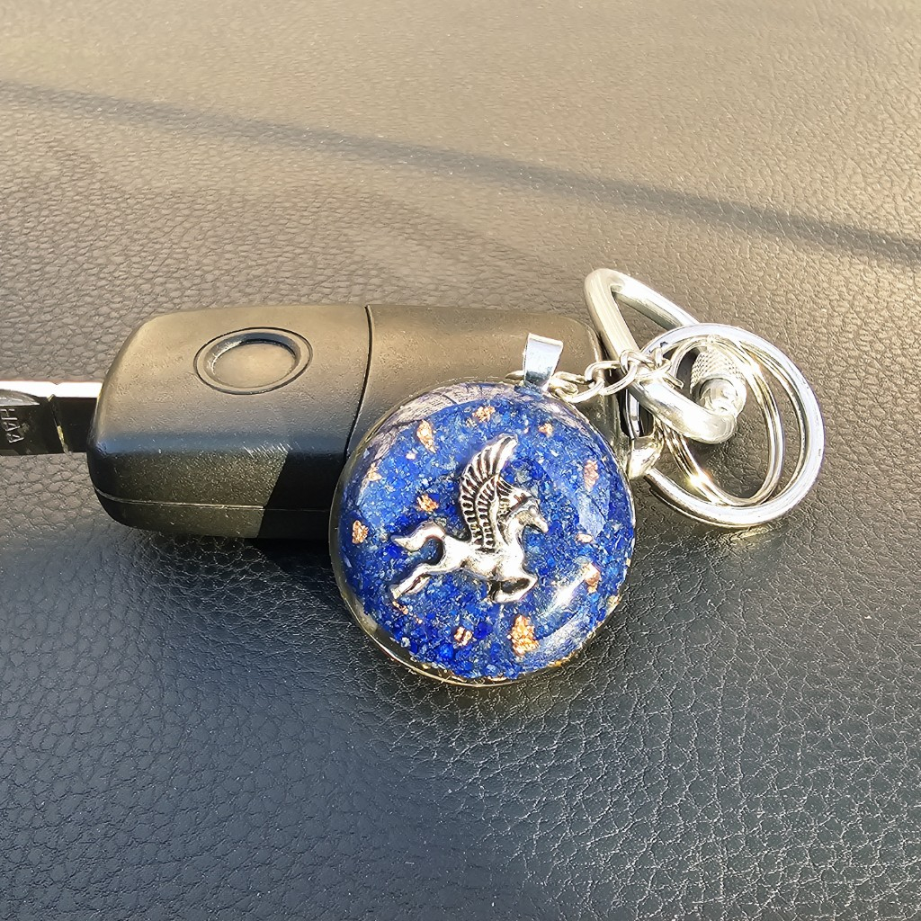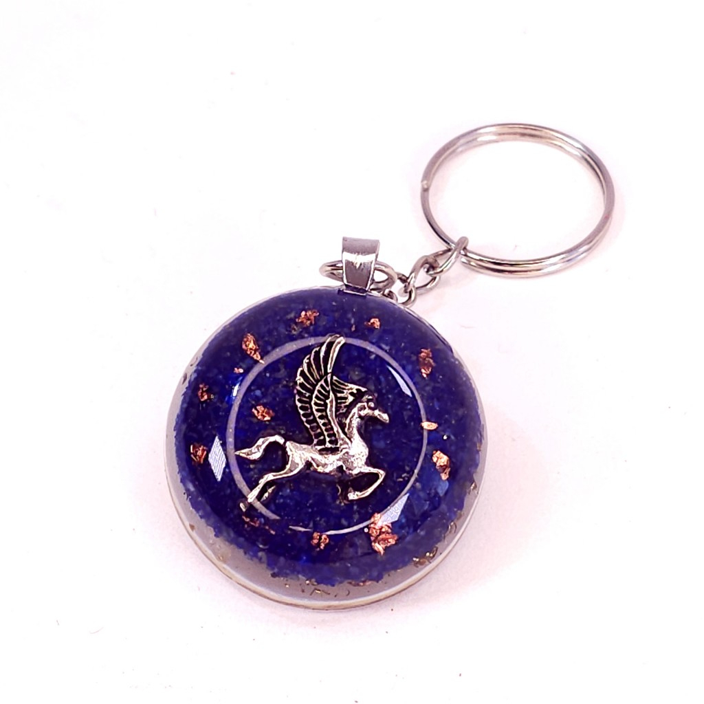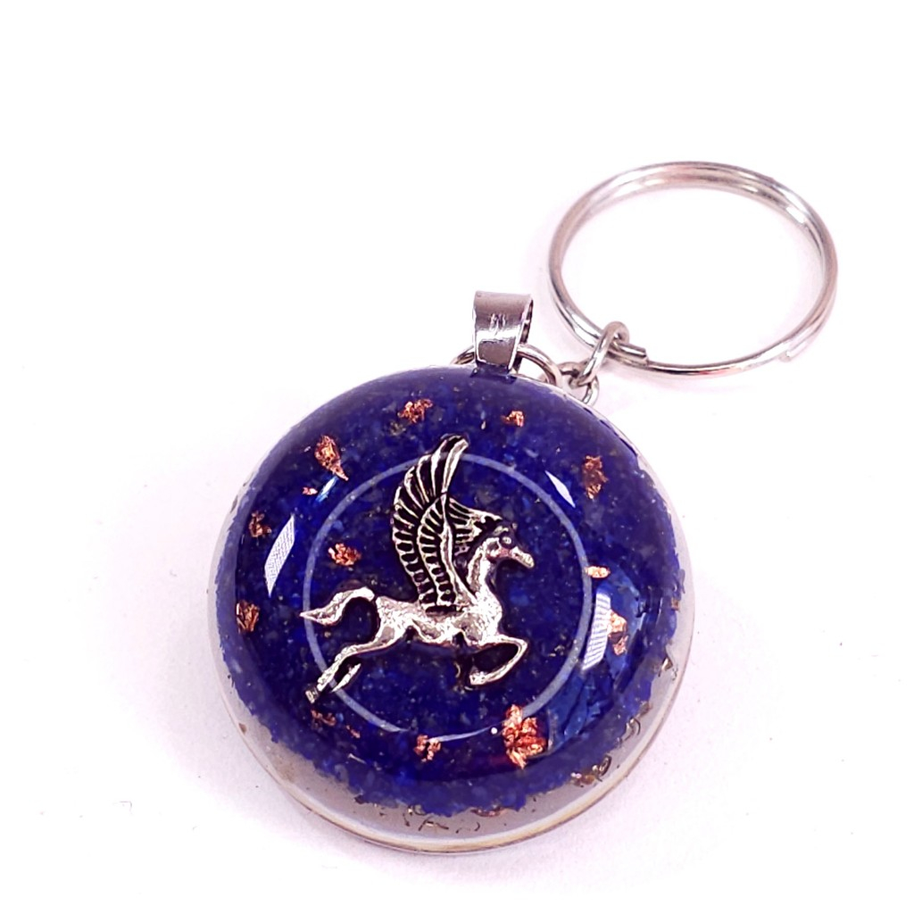 Breloc orgonic din pietre naturale de lapis lazuli, citrin și ochi de tigru, alături de simbolul unui pegas sau cal înaripat, alamă și rășină. Calul înaripat este un simbol al imginației creatoare, elevate, al calităților spirituale, capabile să îl înalțe pe om deasupra pericolului rătăcirii.