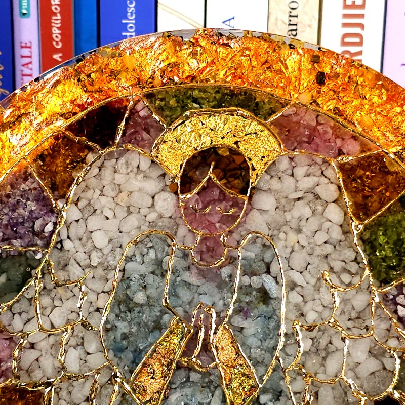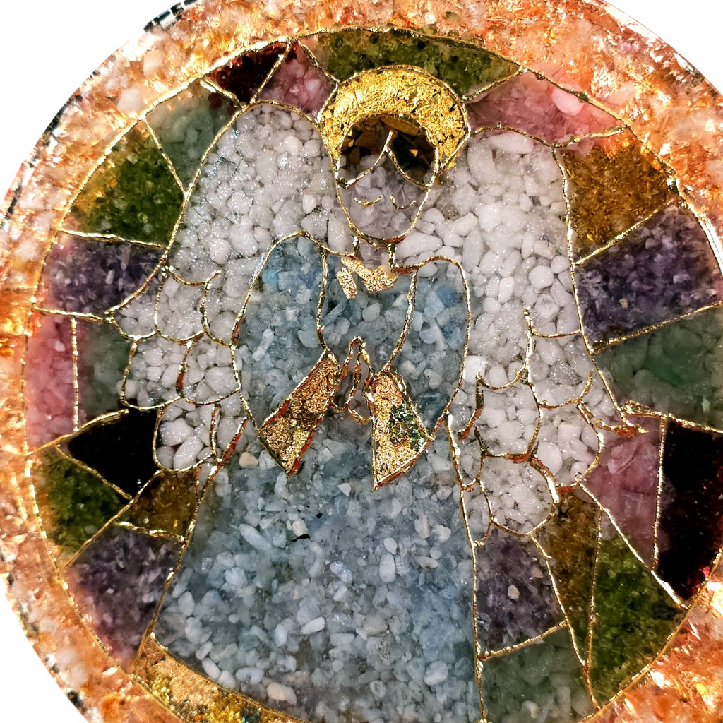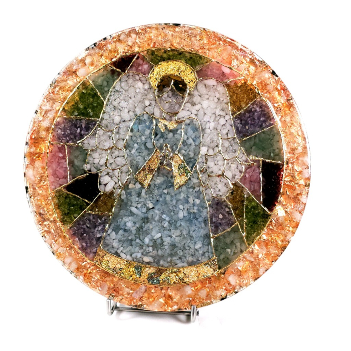 Obiect decorativ Înger în rugăciune realizat în România din pietre naturale de citrin, cuarț, ametist, cuarț roz, peridot, granat, aventurin, agat albastru, ochi de tigru, turmalină neagră. Vitraliu înger din pietre naturale semiprețioase.