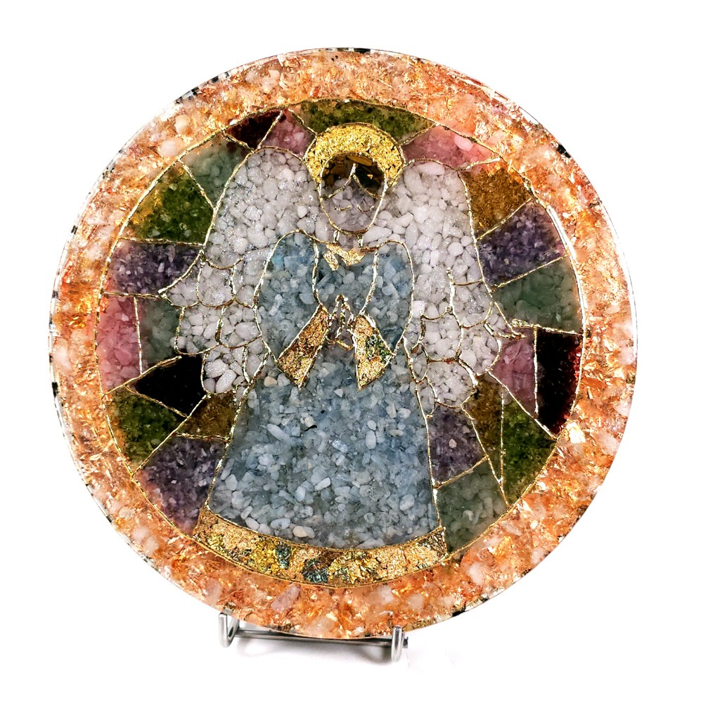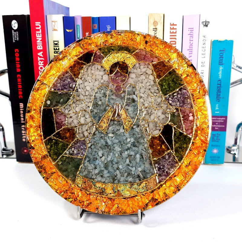 O decorațiune orgon consacrată îngerului păzitor, ghizilor spirituali de Lumină, reprezentând un înger în rugăciune. Icoana angelică este realizată manual în România prin îmbinarea principiilor cristaloterapiei cu cele ale orgonului.