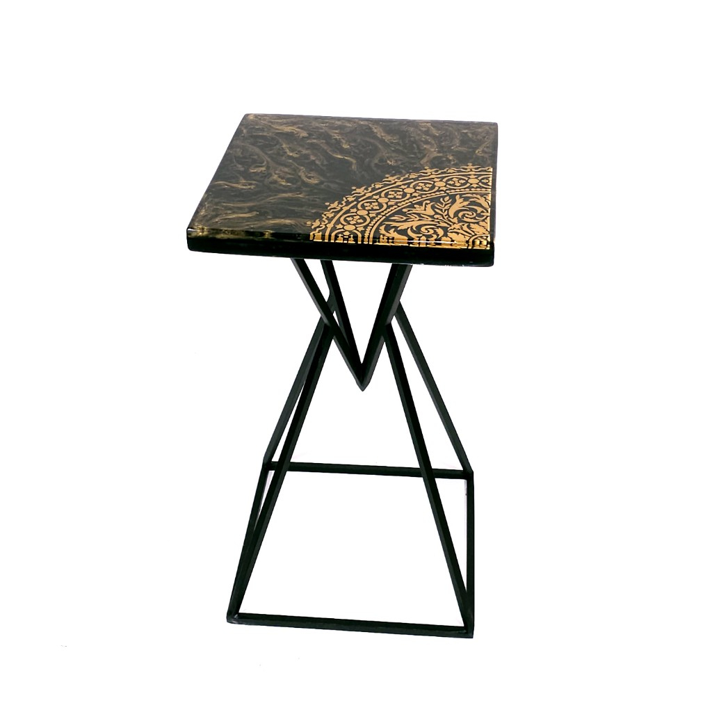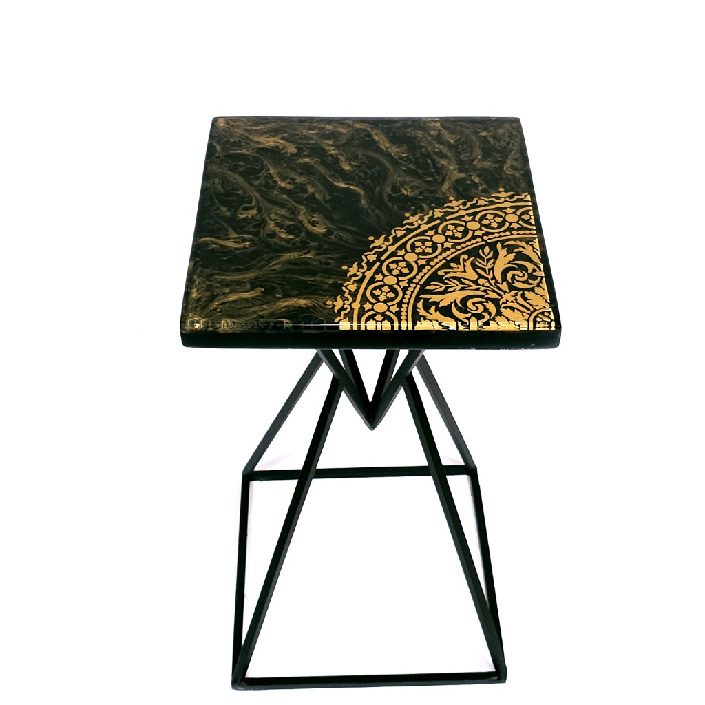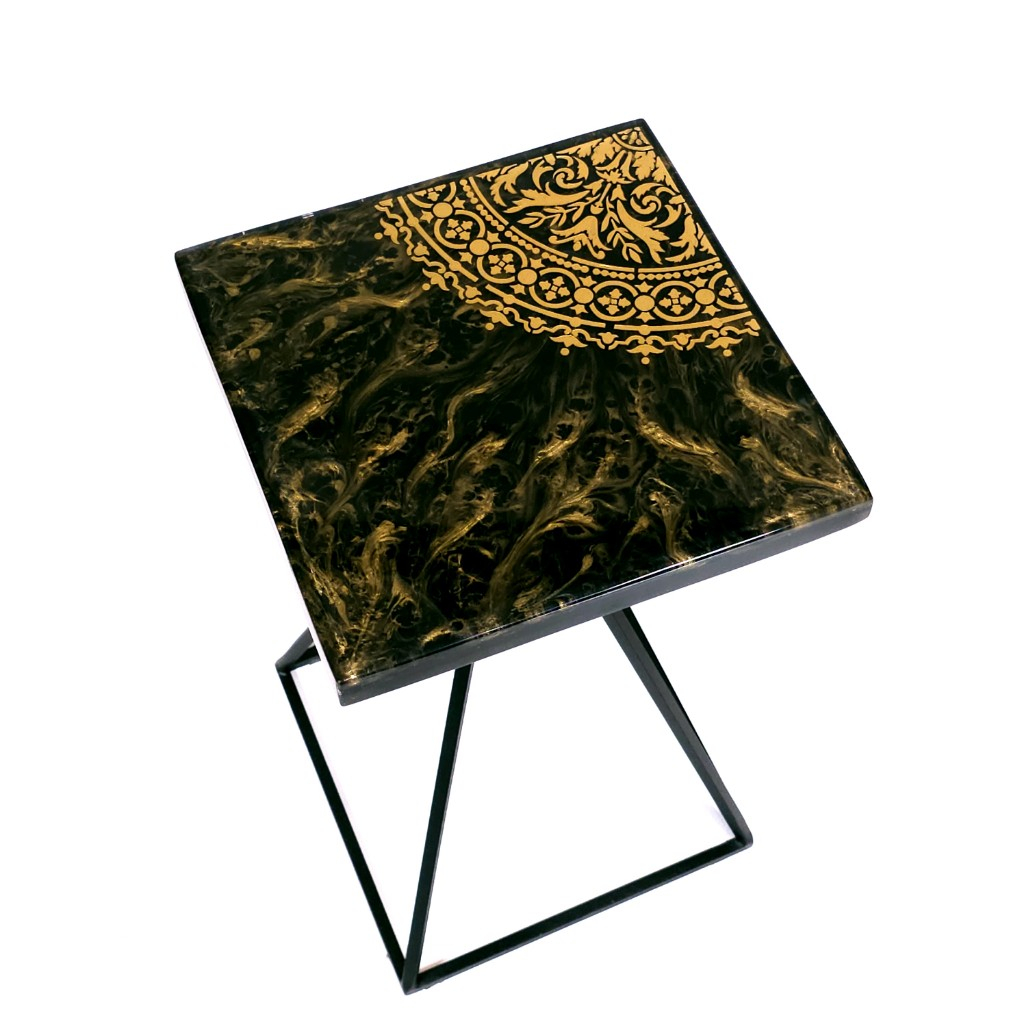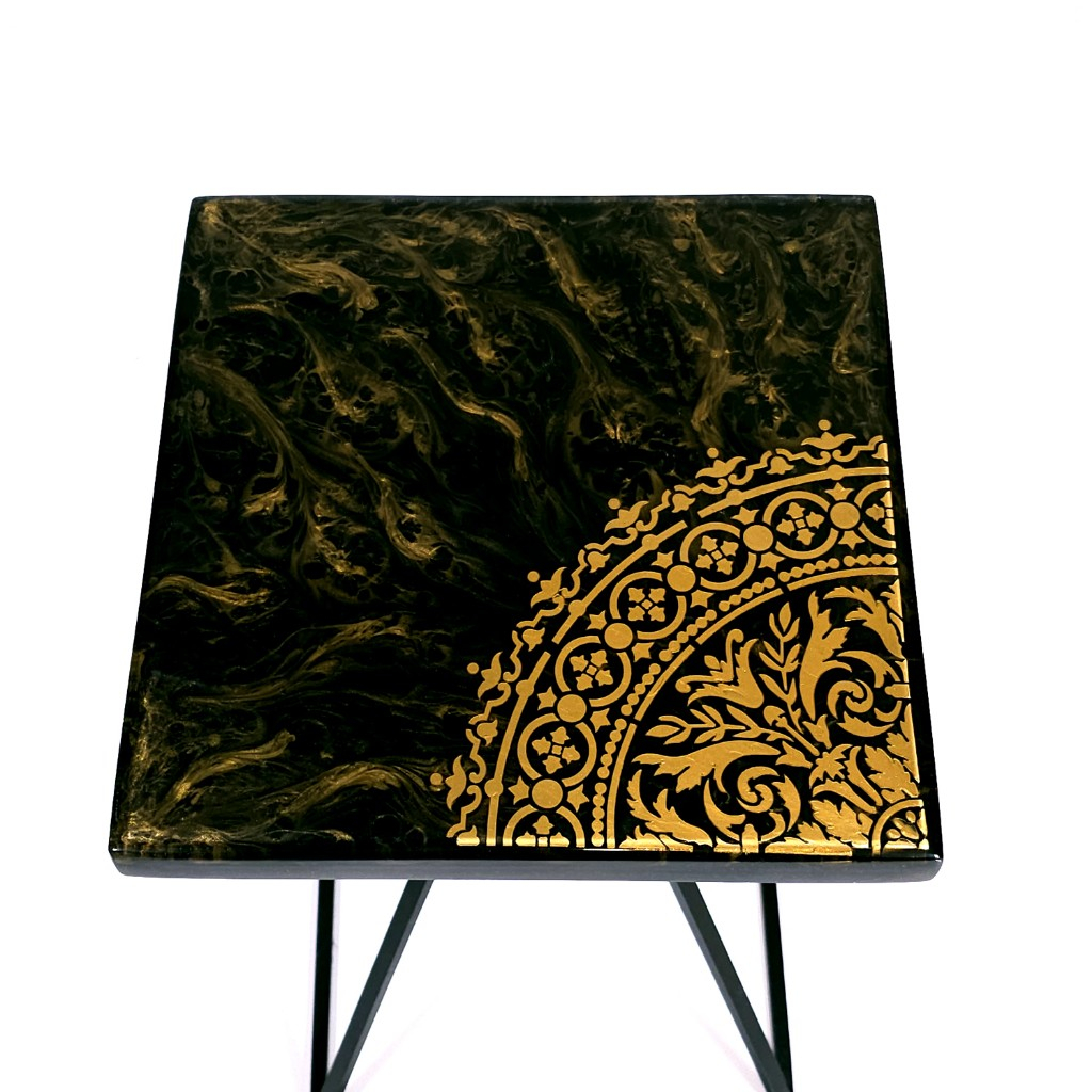 Măsuță decorativă cu model mandală din rășină, cu cristale de cuarț, în culori negru și auriu, pperfectă pentru living, birou sau dormitor.