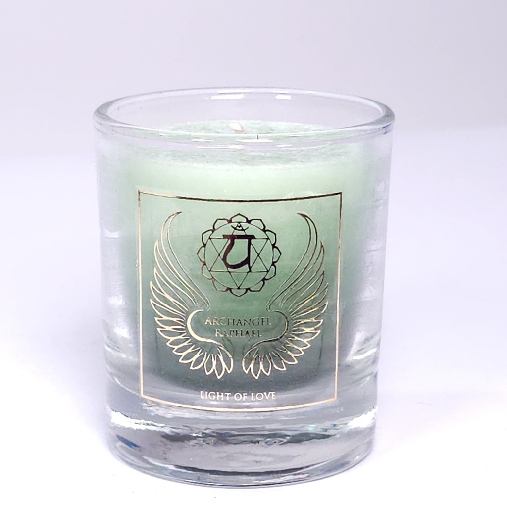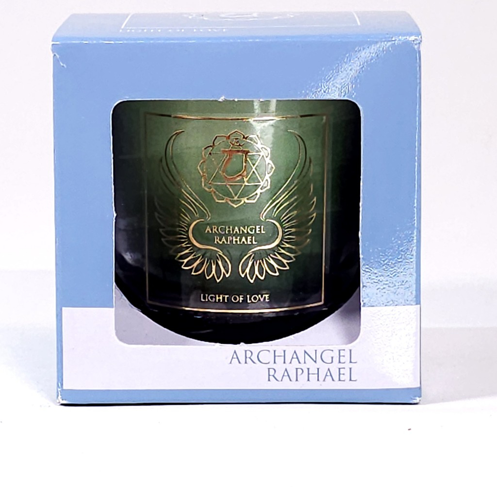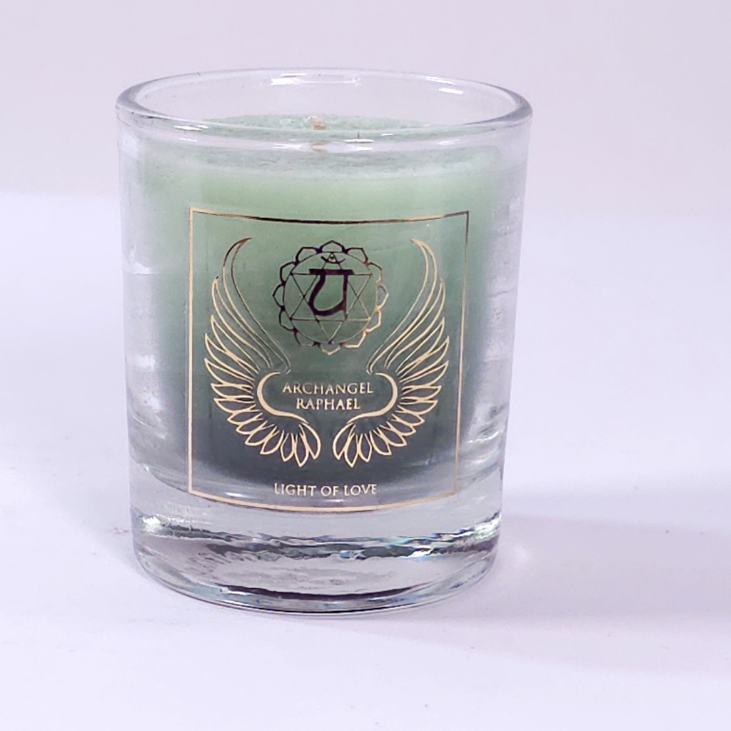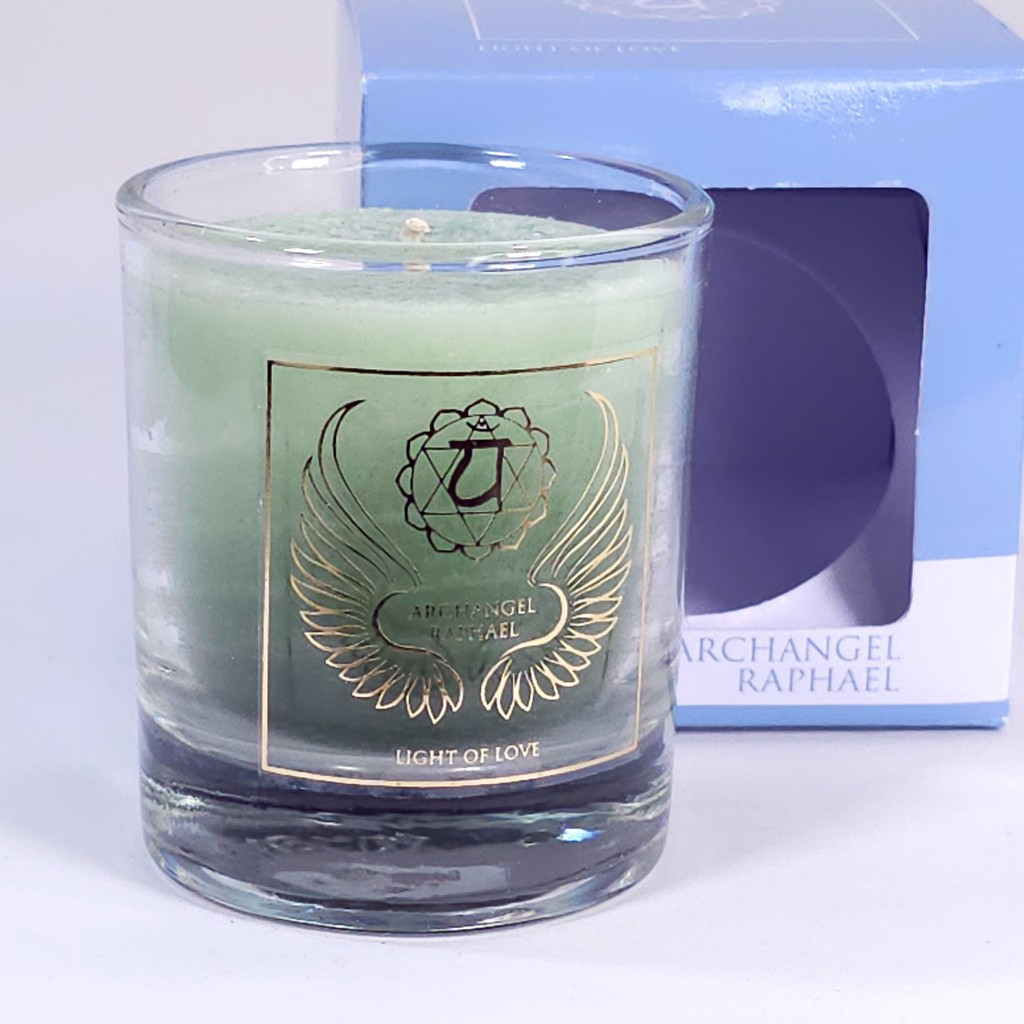 Lumânare verde din ceară naturală dedicată Arhanghelului Rafaael cu uleiuri esențiale pure de lavandă, portocală și mandarină, recomandată și pentru chakra inimii sau Anahata, chakra patru. Lumânarea este doatată cu un suport de sticlă pentru ardere.