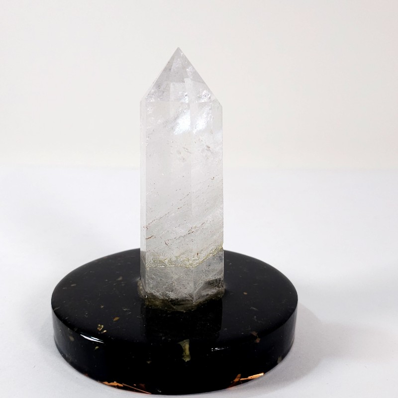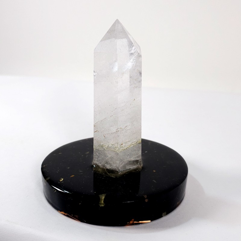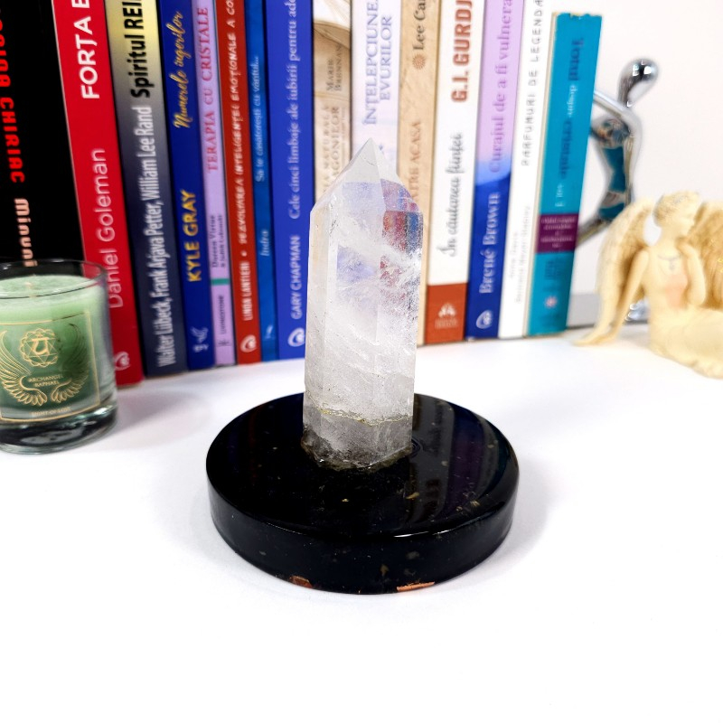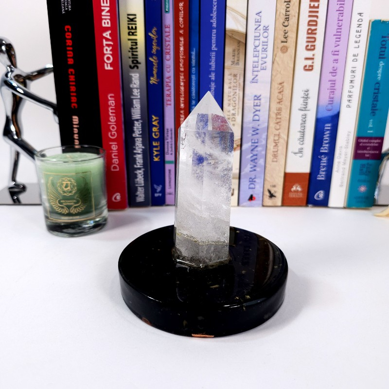 Un frumos obelisc din cristal natural de cuarț, fixat într-un suport orgonic realizat din pietre semiprețioase de turmalina neagră și cuart, cupru și rășină. Cristalul de cuarț poate constitui o deosebită decorațiune pentru casă, birou sau pentru cabinetul de terapie.