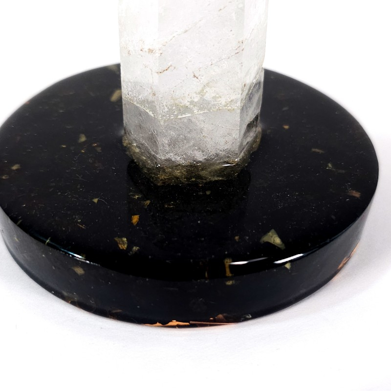 O frumoasă baghetă de cuarț alb fixată într-un suport orgonic din turmalină neagră și cuarț. Instrument cristaloterapie și decorațiune pentru casă, birou sau pentru cabinetul de terapie.