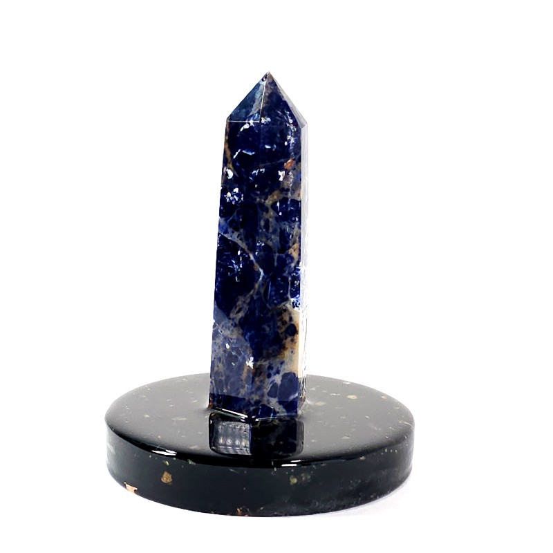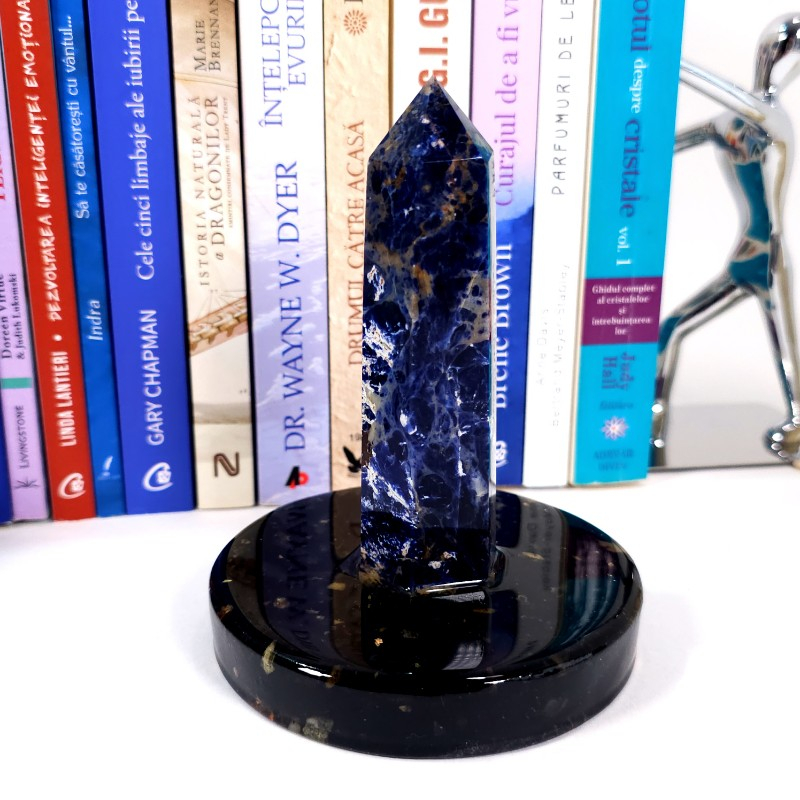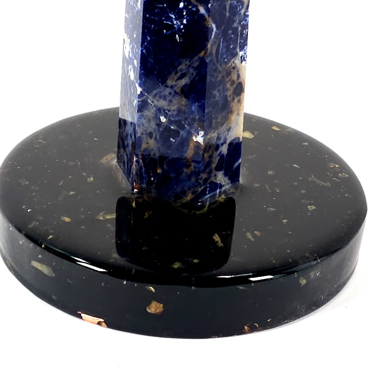 Un frumos obelisc din piată naturală de sodalit, fixat într-un suport orgonic realizat din pietre semiprețioase de turmalina neagră și cuart, cupru și rășină. Aceste ansamblu minetal poate constitui o deosebită decorațiune pentru casă, birou sau pentru cabinetul de terapie.