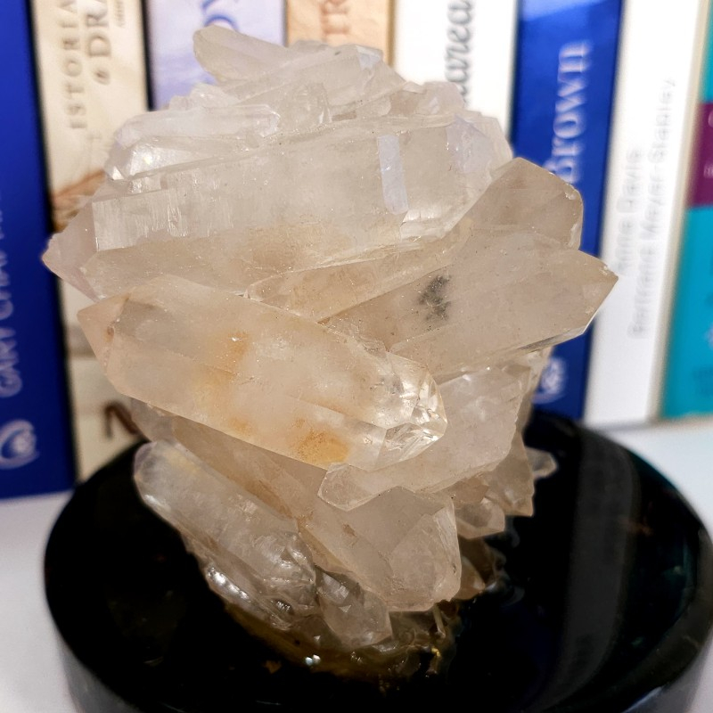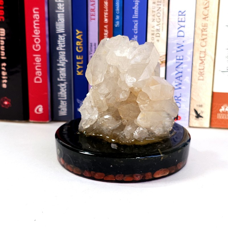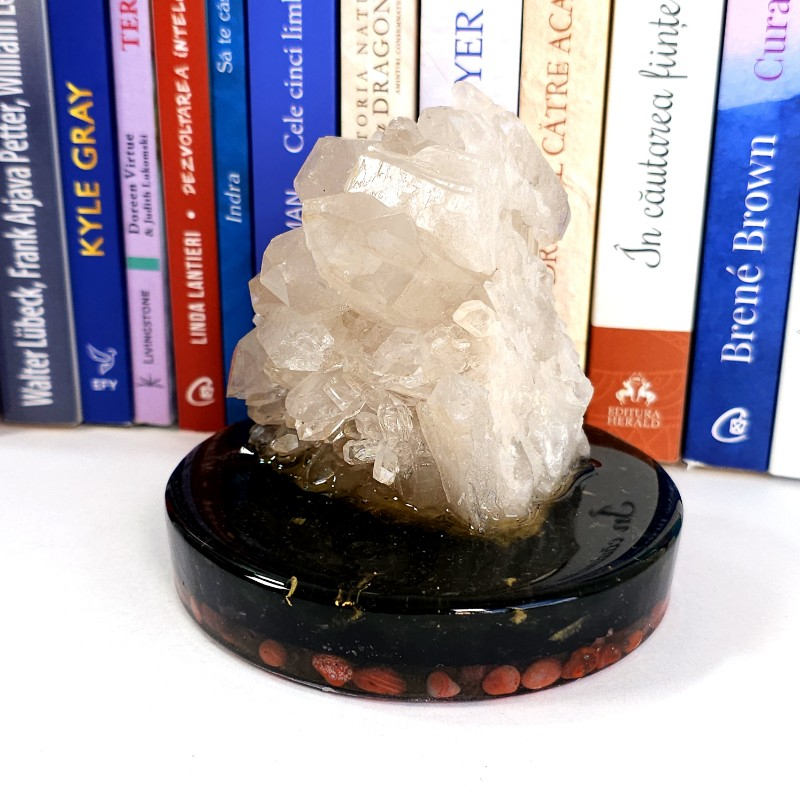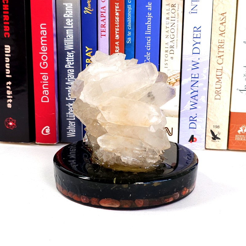 Un rar si frumos esantion mineral, compus dintr-un roi de baghete de cristale de cuarț natural, ce s-au format sudate între ele, formează un spectacol vizual inedit. Aceste deosebit esantion de cuarț a fost fixat într-un suport orgonic realizat din turmalina neagră, jasp roșu, cuarț, alamă și rășină. Acest cluster de cristale de cuarț nu va trece neobservat, fiind o adevărată piesă de colecție pentru pasionații de cristale și pietre semiprețioase. Astfel, ansamblul mineral va constitui o senzațională decorațiune din pietre semipretioase pentru casă, birou sau pentru cabinetul de terapie.