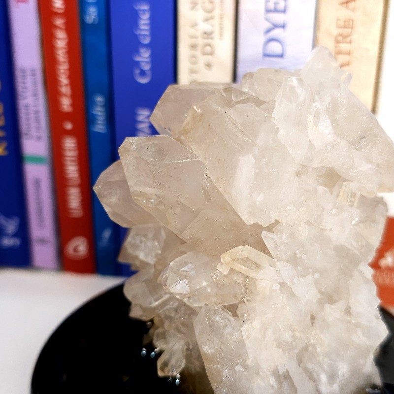 Dincolo de frumusețea și unicitatea sa, acest eșantion mineral este și un veritabil instrument cristalo-terapeutic, putând fi programat și încărcat energetic, utilizat în practici terapeutice, energetice sau spirituale, în purificarea energetica și încărcarea cu energii benefice, elevate a spațiului în care se află. Prin alăturarea discului orgonic acestui cluster de cristale naturale de cuarț, am potențat proprietățile acestuia, cu precădere capacitatea de protecție electromagnetică.