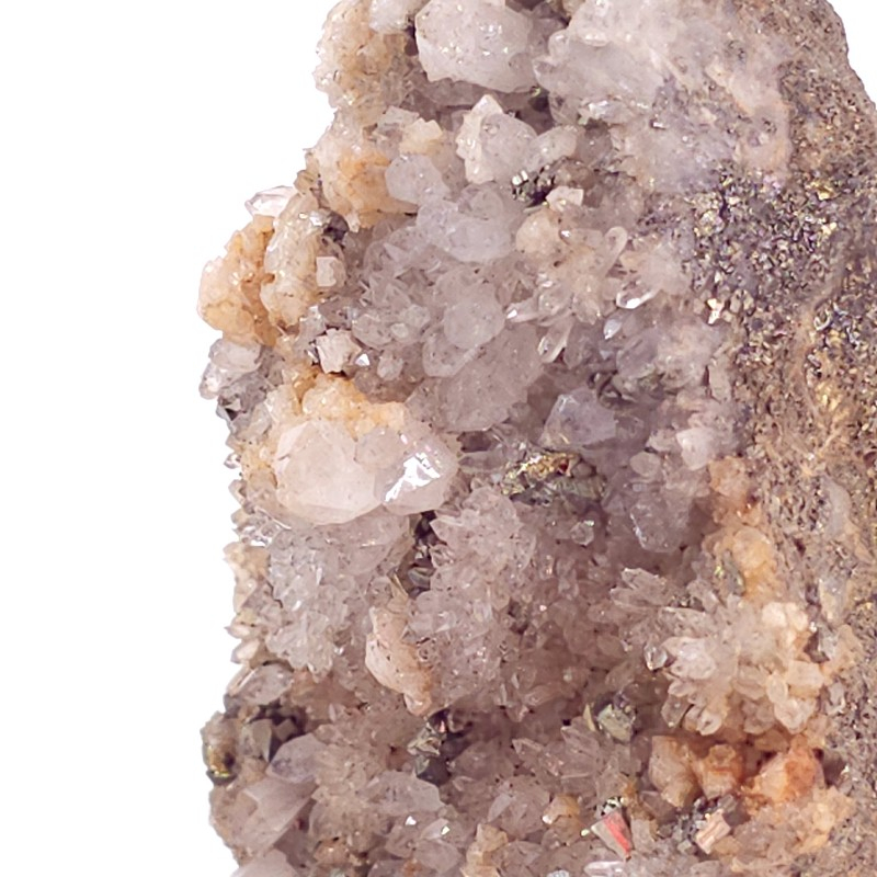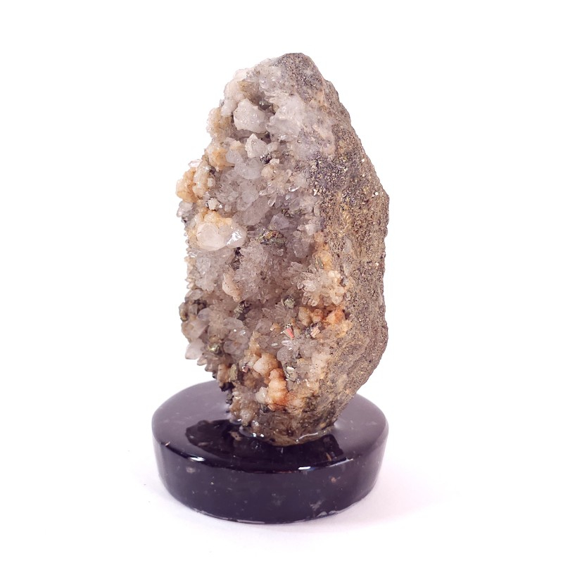 Un frumos esantion mineral, compus din cristale natural de cuarț alb. Acest eșantion de cuarț cu pirită a fost fixat într-un suport orgonic realizat din pietre naturale de turmalina neagră și cuarț, alături de alamă și rășină. Astfel, ansamblul mineral va constitui o senzațională decorațiune din pietre semipretioase pentru casă, birou sau pentru cabinetul de terapie. Un asnsamblu ce îmbină beneficiile cristaloterapiei cu cele ale ogonului, ideal de aplasat pe birou, între sursa de radiații eletromangnetice si corp.
