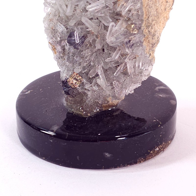 Un frumos esantion mineral, compus din cristale natural de cuarț alb. Acest eșantion de cuarț cu pirită a fost fixat într-un suport orgonic realizat din pietre naturale de turmalina neagră și cuarț, alături de alamă și rășină. Astfel, ansamblul mineral va constitui o senzațională decorațiune din pietre semipretioase pentru casă, birou sau pentru cabinetul de terapie. Un asnsamblu ce îmbină beneficiile cristaloterapiei cu cele ale ogonului, ideal de aplasat pe birou, între sursa de radiații eletromangnetice si corp.