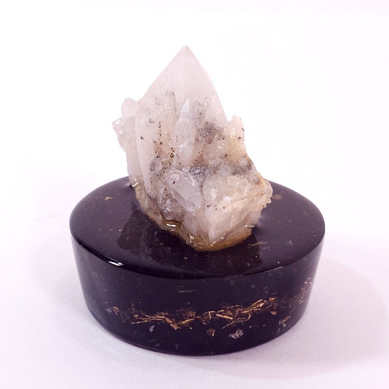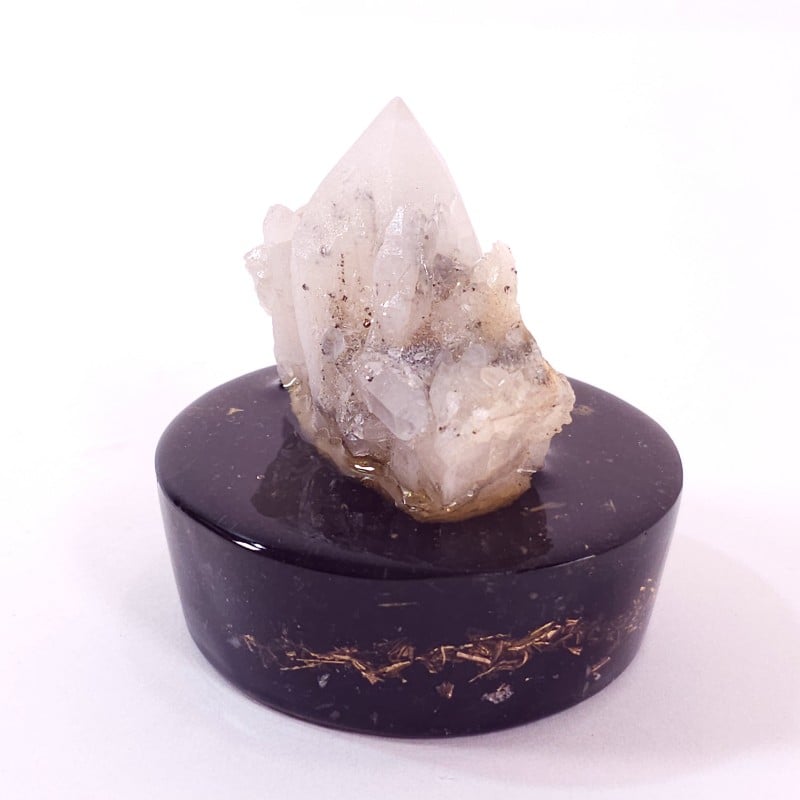 Un frumos esantion mineral, compus din vârfuri naturale de cristale de cuarț. Acest esantion de cuarț a fost fixat într-un suport orgonic realizat din pietre naturale de turmalina neagră și cuarț, alături de alamă și rășină. Astfel, ansamblul mineral va constitui o senzațională decorațiune din pietre semipretioase pentru casă, birou sau pentru cabinetul de terapie. Un asnsamblu ce îmbină beneficiile cristaloterapiei cu cele ale ogonului, ideal de aplasat pe birou, între sursa de radiații eletromangnetice si corp.