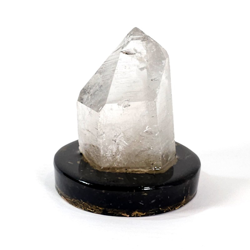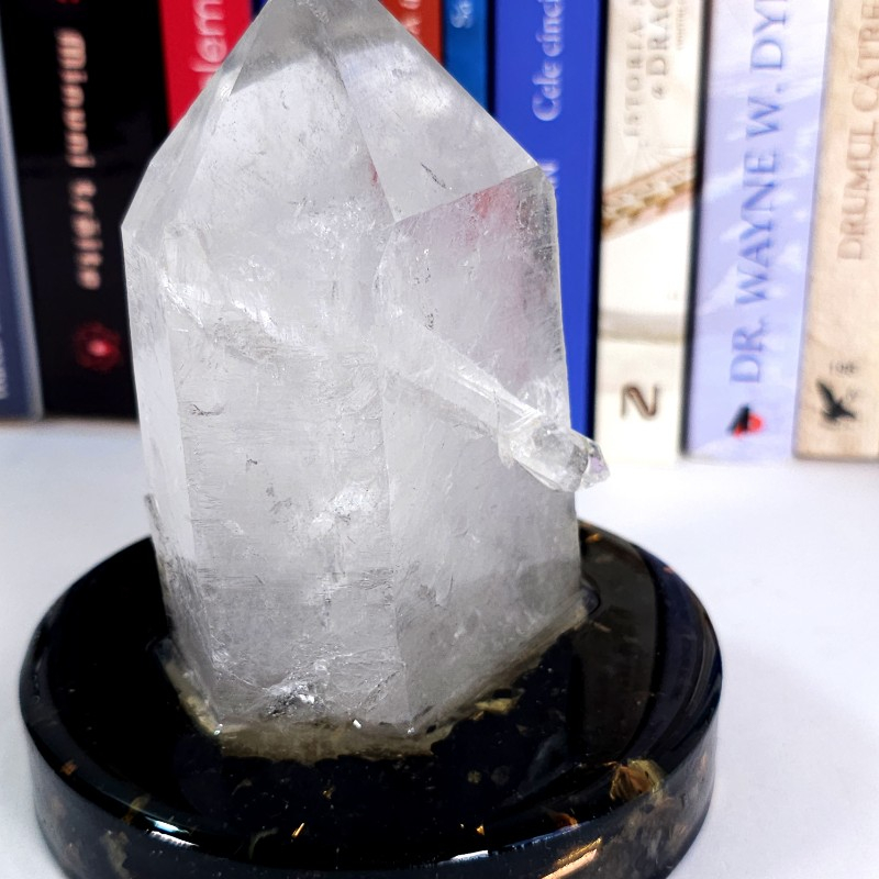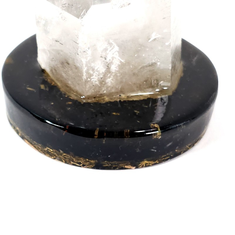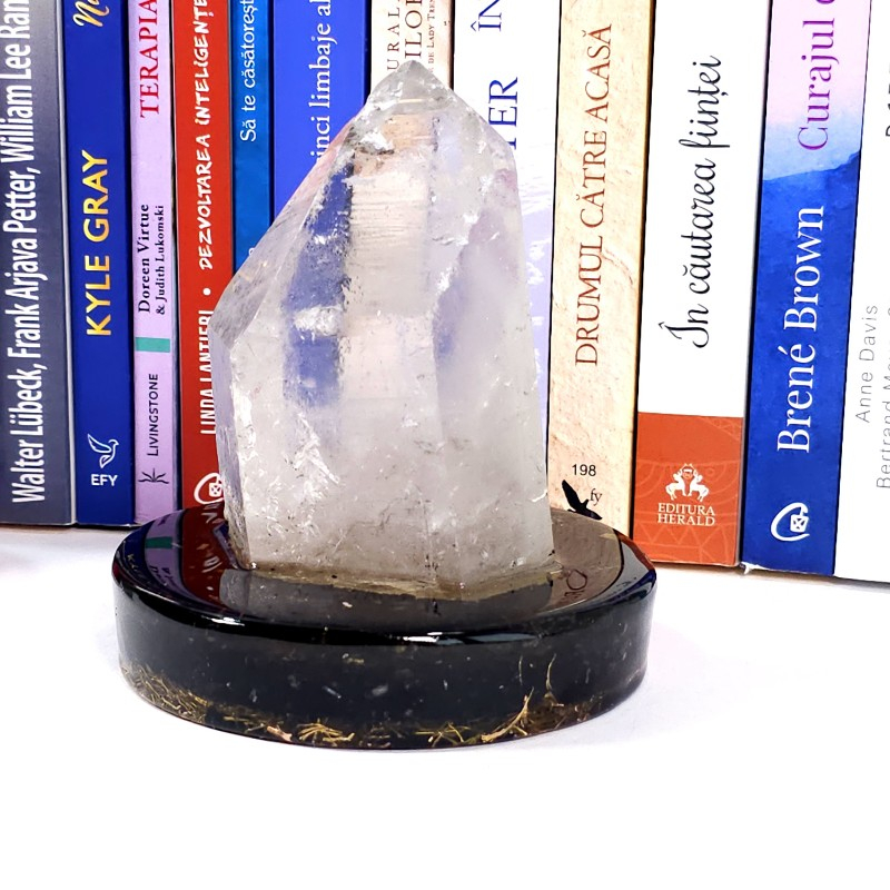Un frumos și rar cristal de a fost cuarț, compus din 2 vârfuri naturale, unul principal și un altul mai mic, atașat pe o latră a celui principal, fixat într-un suport orgonic realizat din turmalina neagră, jasp roșu, cuarț, alamă, cupru și rășină. Un spectaculos cristal de cuarț ce nu va trece neobservat, fiind o adevărată piesă de colecție pentru pasionații de cristale și pietre semiprețioase. Cristalul de cuarț va constitui un senzațional obiect de decor, o elegantă decorațiune pentru casă, birou sau pentru cabinetul de terapie.
