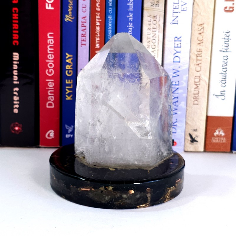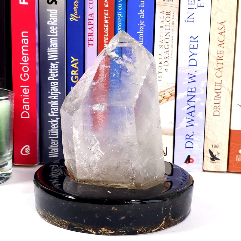 Un frumos vârf natural de cuarț fixat într-un suport orgonic din turmalină neagră, jasp roșu și cuarț. Obiect de decor pentru casa, birou sau pentru cabinetul de terapie și instrument de cristaloterapie.