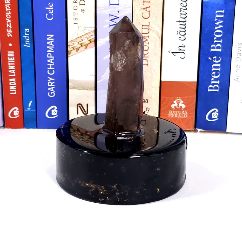 Cuarț fumuriu cu baghetă cu vârf natural fixat într-un suport orgonic realizat din turmalina neagră, cuarț, alamă și cupru. O adevărată piesă de colecție pentru pasionații de cristale și pietre naturale ce va constitui o elegantă și discretă decorațiune pentru casă, birou sau pentru cabinetul de terapie.