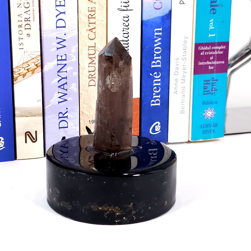 Cuarț fumuriu cristal cu vârf natural pe suport orgonic din turmalină neagră și cuarț. Decorațiune și instrument cristaloterapie pentru casă, birou sau pentru cabinetul de terapie