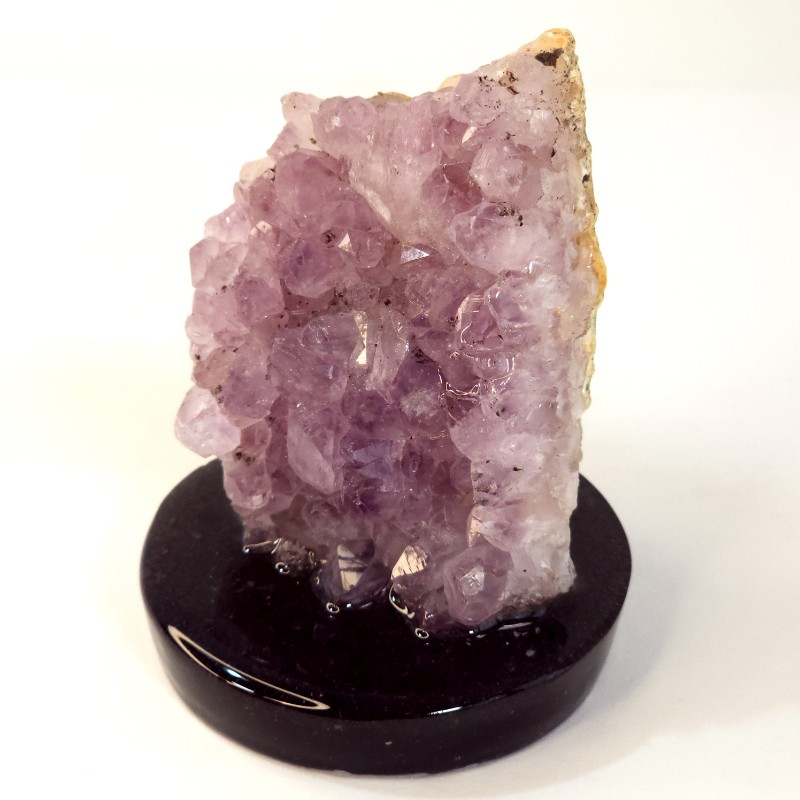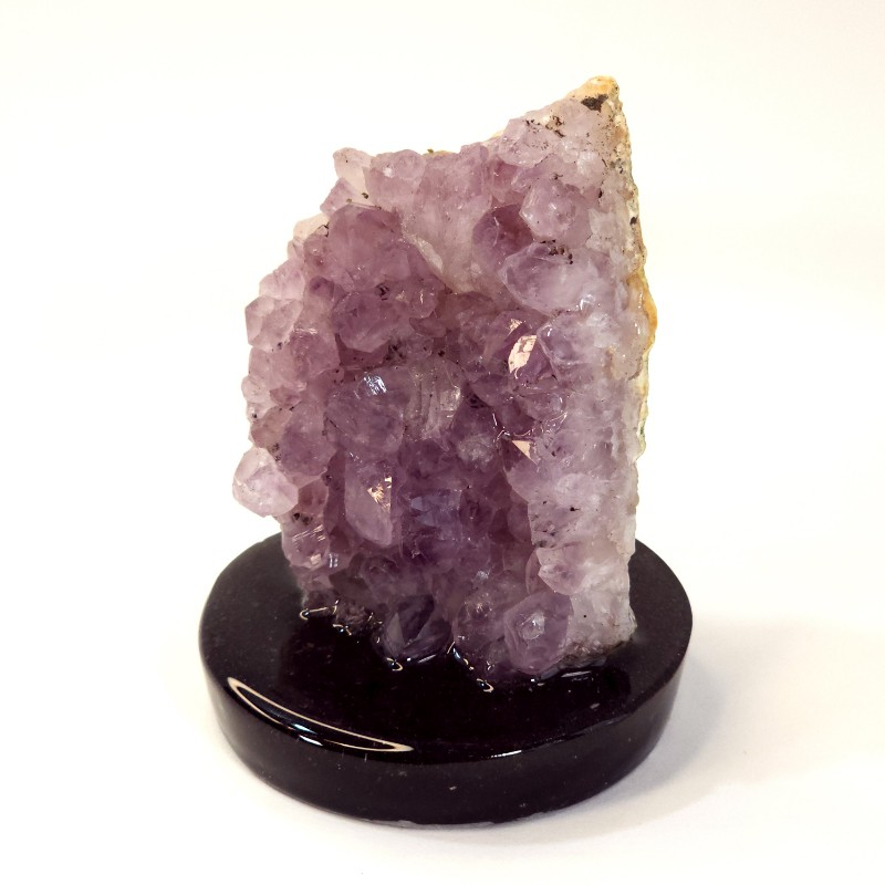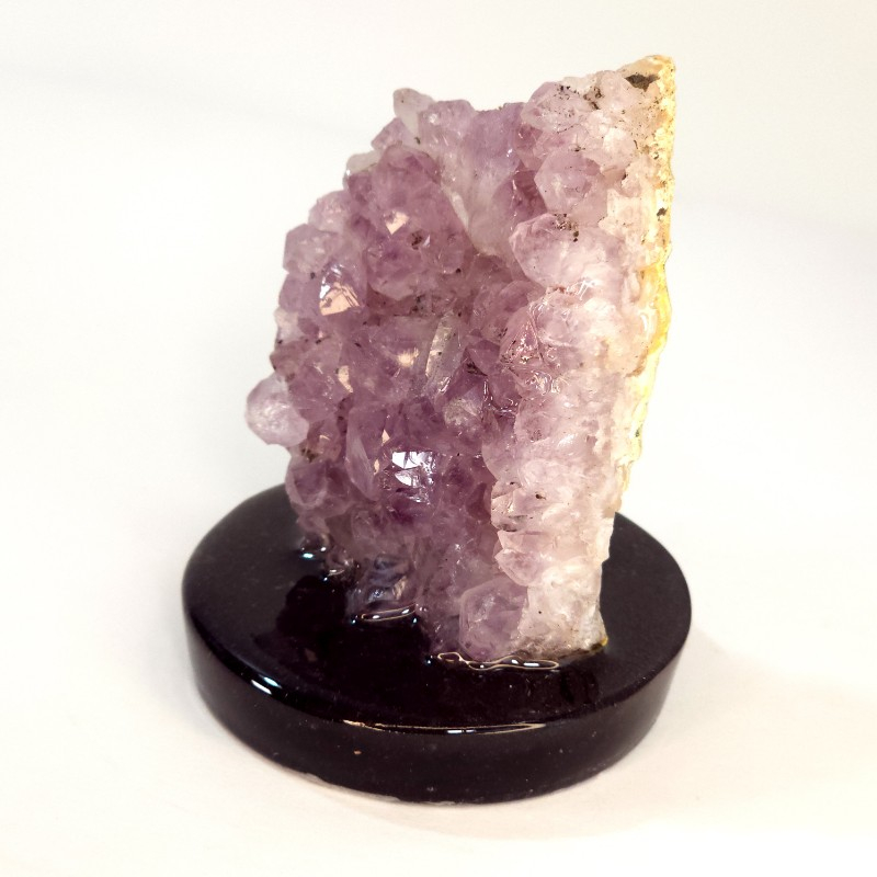 O frumoasă secțiune de geodă de ametist cu o nuanță intensă de mov fixată într-un suport orgonic realizat din turmalina neagră, cuarț, alamă și cupru. Poate fi piesă de colecție pentru pasionații de cristale și pietre semiprețioase ce va constitui un plăcut obiect de decor, o elegantă decorațiune pentru casă, birou sau pentru cabinetul de terapie.