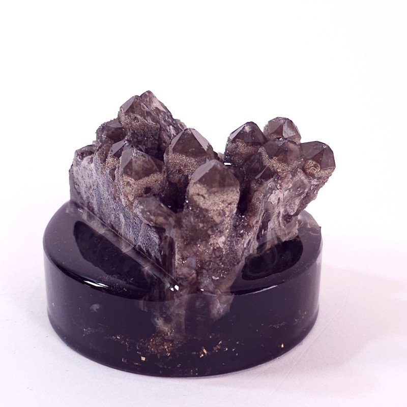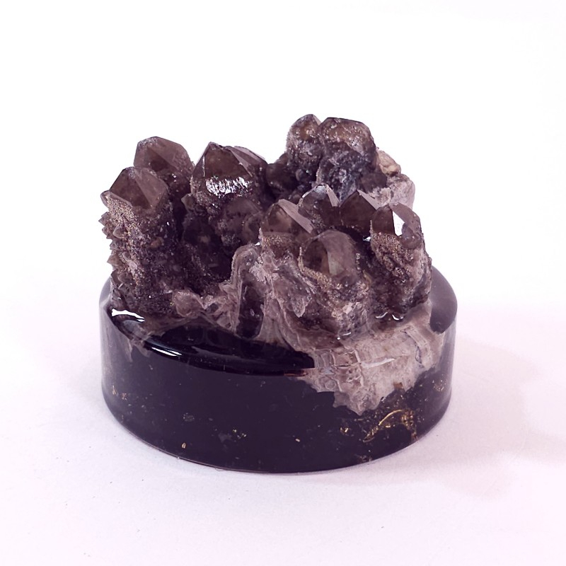 Decorațiune eșantion de cristale de cuarț fumuriu pe suport orgonic din turmalină neagră și cuarț. Decorațiune pentru casă, birou sau pentru cabinetul de terapie