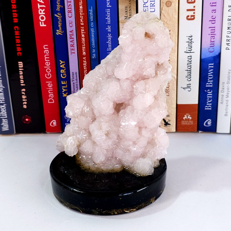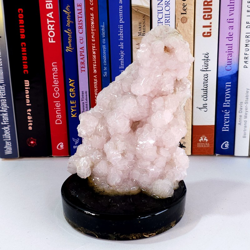 Un frumos eșantion mineral de cristale de calcit roz sau manganocalcit, fixat într-un suport orgonic realizat din turmalina neagră, cuarț, alamă și rășină. Această floare de mină din calcit roz nu va trece neobservată, fiind o adevărată piesă de colecție pentru pasionații de cristale și pietre semiprețioase. Astfel, ansamblul mineral va constitui un senzațional obiect de decor din pietre semipretioase, o elegantă decorațiune pentru casă, birou sau pentru cabinetul de terapie.