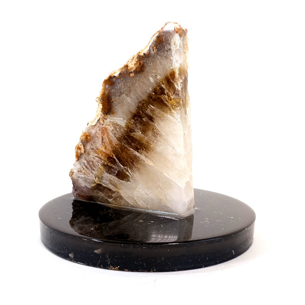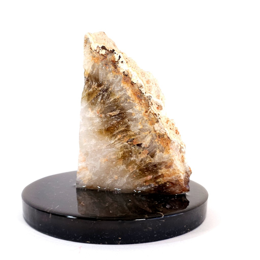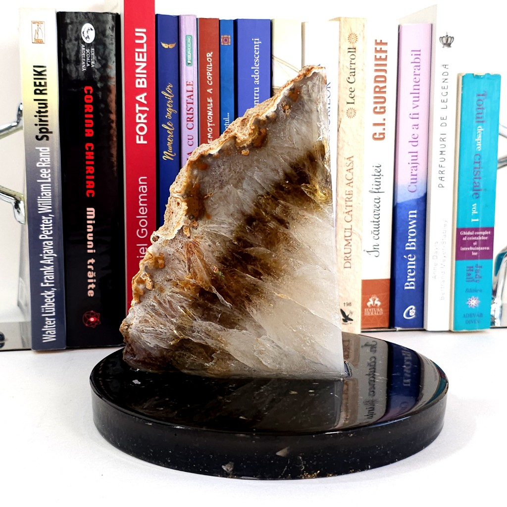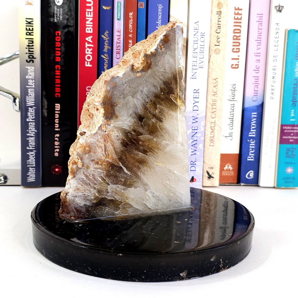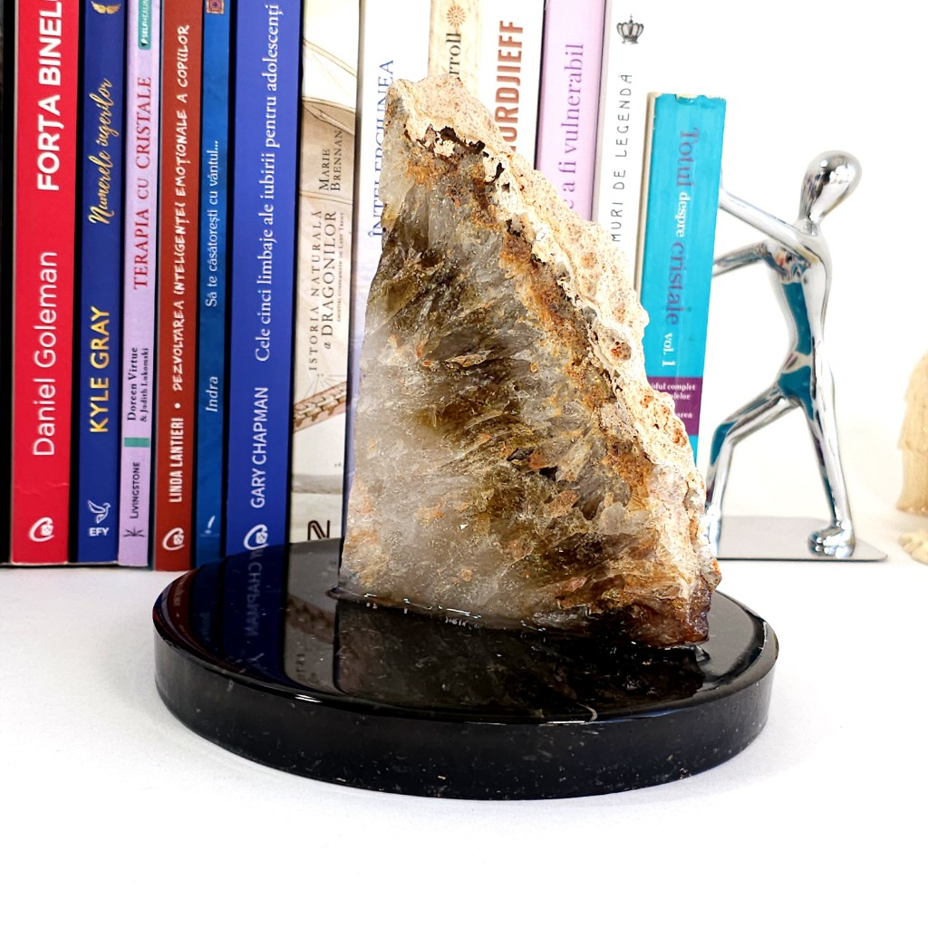 Este o piesă decorativă elegantă, cu un design natural și sofisticat. Prin culoarea sa caldă, galben-aurie, aduce lumină și vitalitate în cameră, în timp ce baza neagră din turmalină creează echilibru și profunzime vizuală. Se integrează perfect în decoruri care combină elemente moderne cu accente naturale.