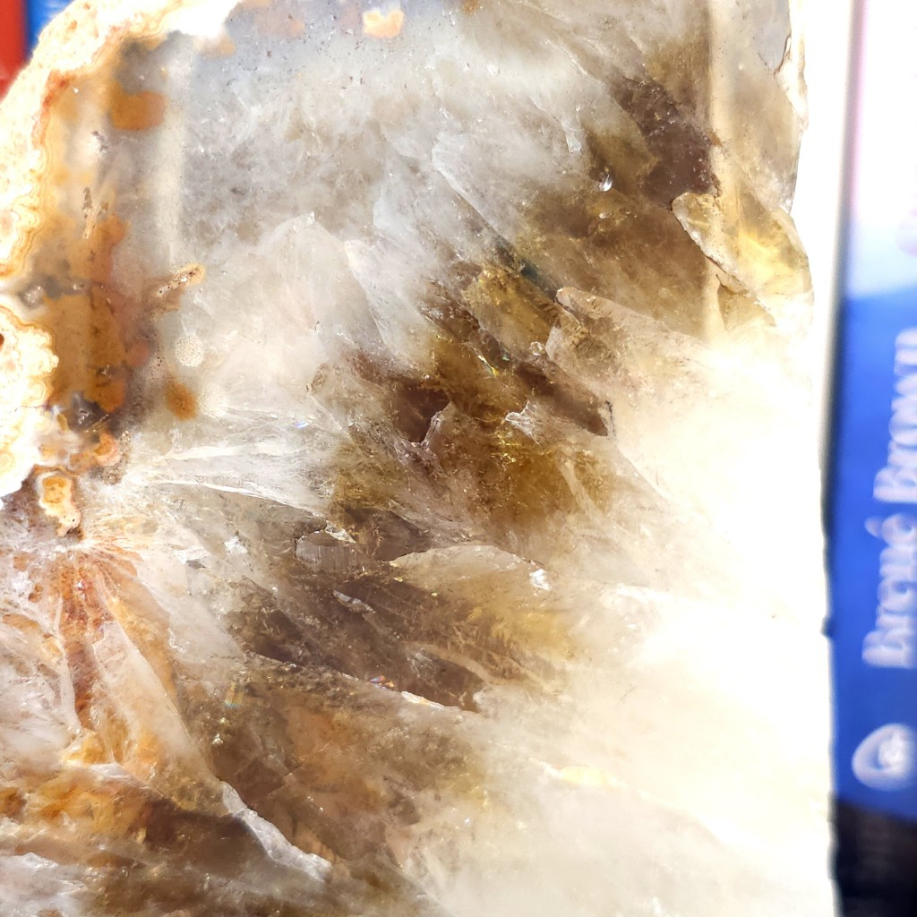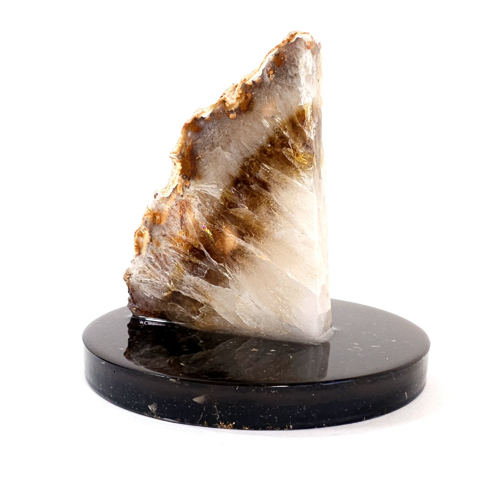 O frumoasă felie din geodă de citrin, cu detalii spectaculoase. Eșantionul de citrin este fixat într-un suport orgonic realizat din pietre naturale semiprețioase de turmalina neagră și cuarț, alături de alamă și rășină. Acest cristalul de citrin este șlefuit pe o față, iar cealaltă față este în formă brută.