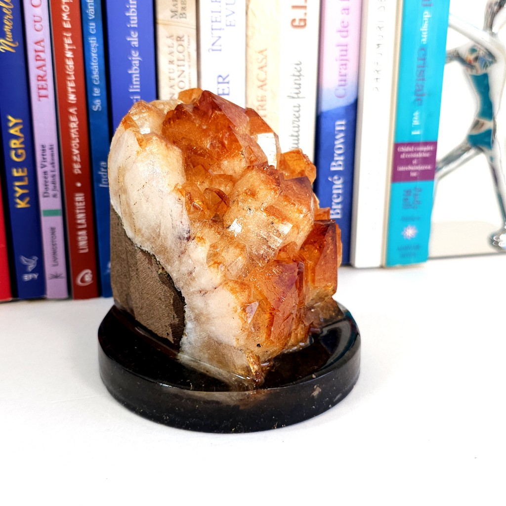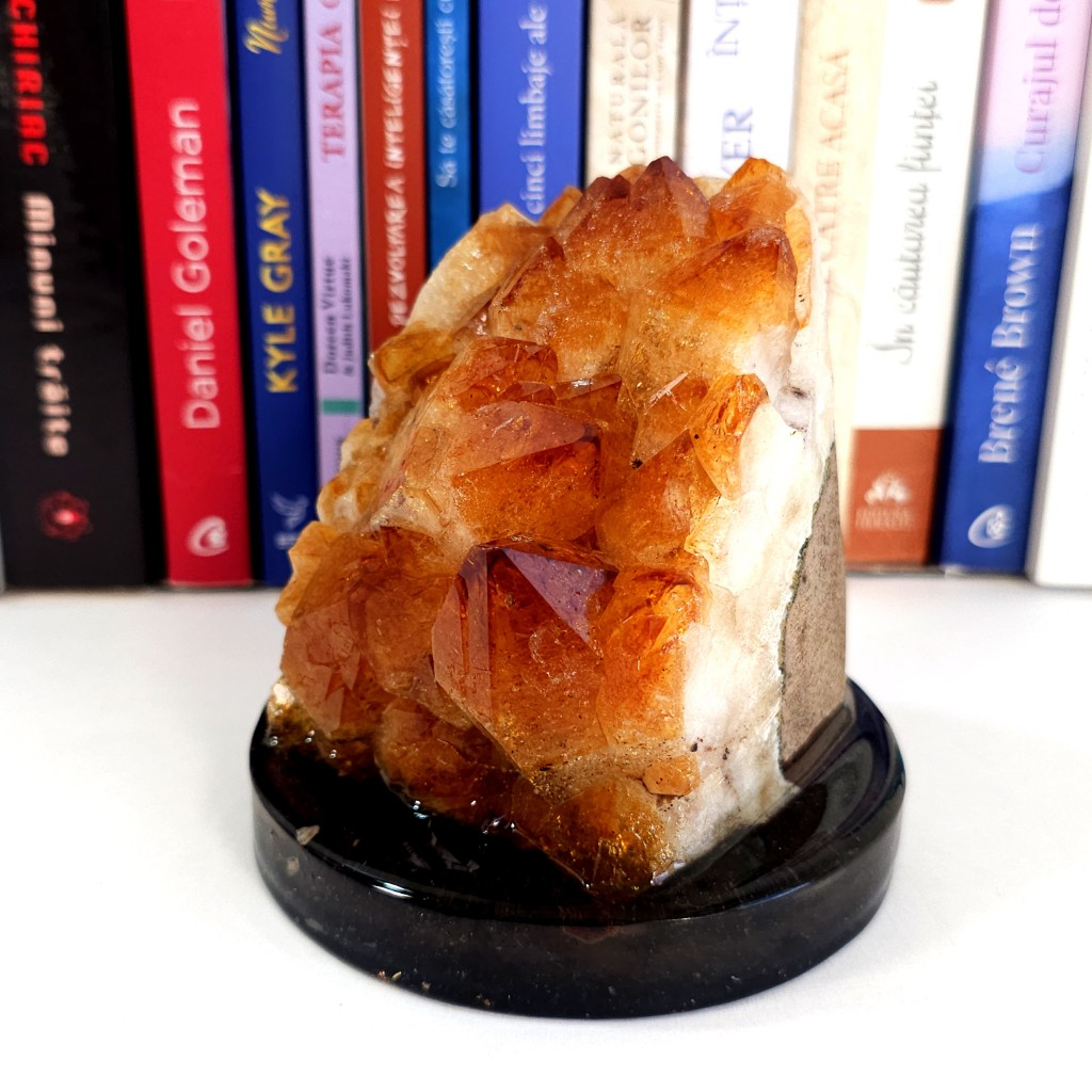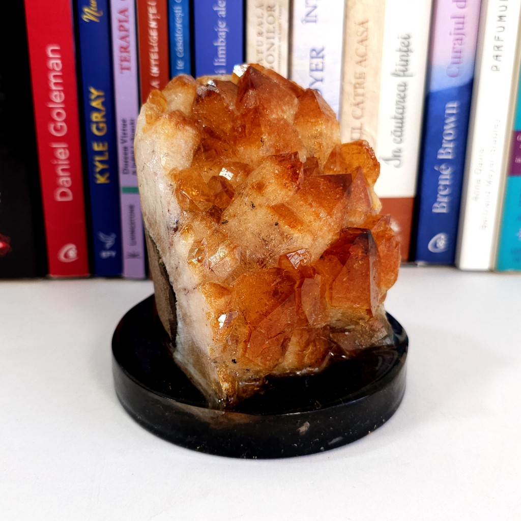 O frumoasă geodă de citrin, de dimensiuni generoase, fixată într-un suport orgonic. Discul orgon a fost realizat pentru a evidentia, a sustine si a curata energetic un frumos esantion din citrin (nota: acest citrin a fost un ametist supus unor temperaturi ridicate, ce imita procesul natural de formare a citrinului) ce a facut parte dintr-o geoda. Discul, baza intregului ansamblu a fost realizat folosind multa turmalina neagra, cuart alb cupru, alama si rasina. Suportul orgonic susține perfect, în poziție verticală clusterul de cuarț, protejând, în același timp, suprafețele pe care este așezat. Mai mult, fiind un orgon, sunt potențate proprietățile cristaloterapeutice ale pietrelor și cristalelor naturale, cu precădere capacitatea de protecție împotriva radiațiilor electromagnetice.