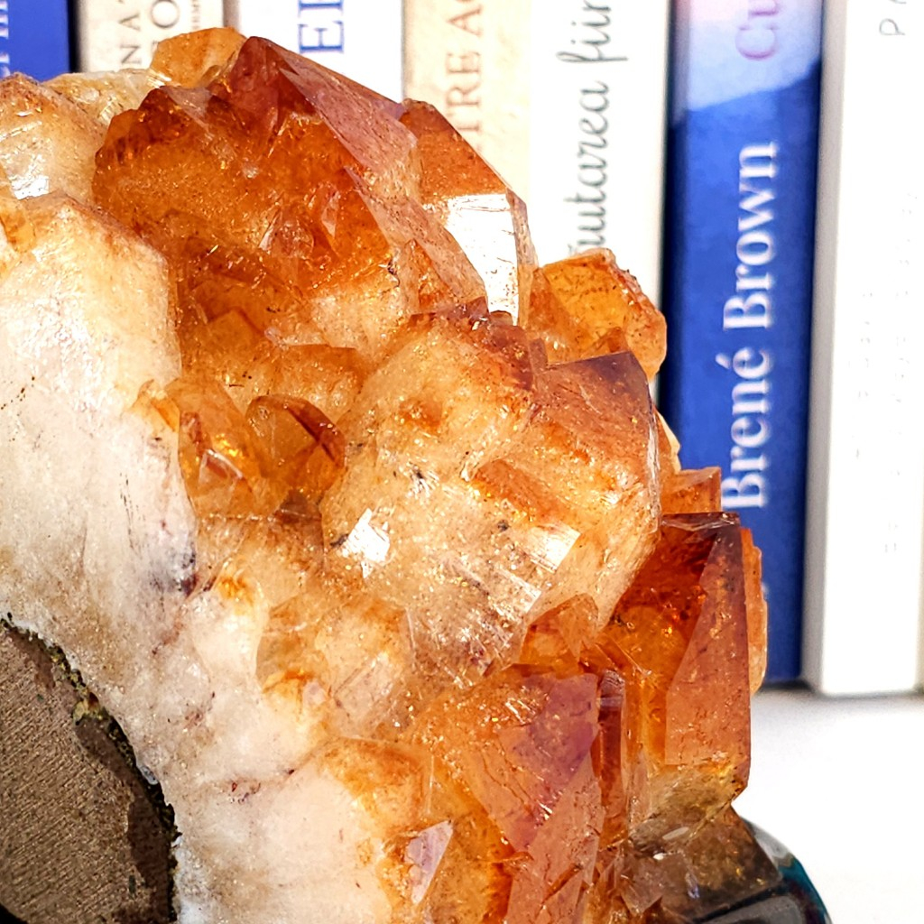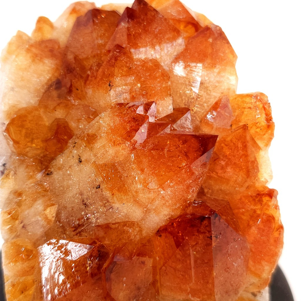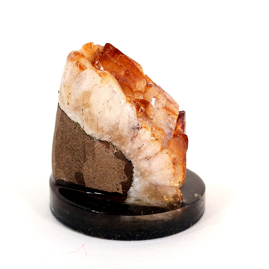O frumoasă geodă de citrin, de dimensiuni generoase, fixată într-un suport orgonic. Discul orgon a fost realizat pentru a evidentia, a sustine si a curata energetic un frumos esantion din citrin (nota: acest citrin a fost un ametist supus unor temperaturi ridicate, ce imita procesul natural de formare a citrinului) ce a facut parte dintr-o geoda. Discul, baza intregului ansamblu a fost realizat folosind multa turmalina neagra, cuart alb cupru, alama si rasina. Suportul orgonic susține perfect, în poziție verticală clusterul de cuarț, protejând, în același timp, suprafețele pe care este așezat. Mai mult, fiind un orgon, sunt potențate proprietățile cristaloterapeutice ale pietrelor și cristalelor naturale, cu precădere capacitatea de protecție împotriva radiațiilor electromagnetice.