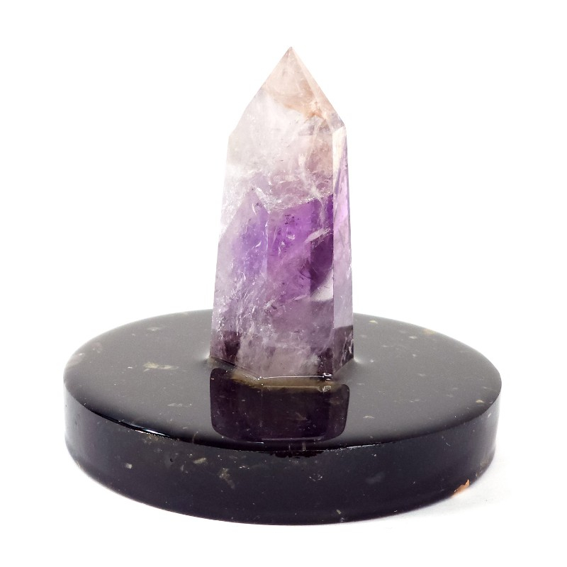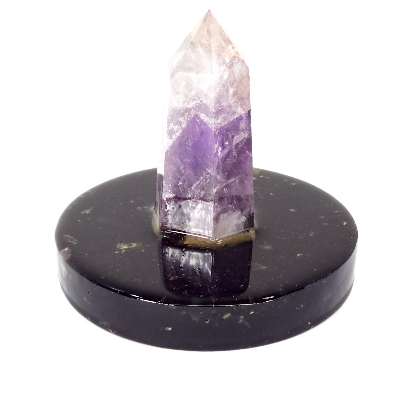 O frumoasă baghetă din cristal natural de ametist, fixată într-un suport orgonic realizat din pietre naturale de turmalina neagră și cuart, cupru și rășină. Acest ansamblu mineral poate constitui o deosebită decorațiune pentru casă, birou sau pentru cabinetul de terapie.
