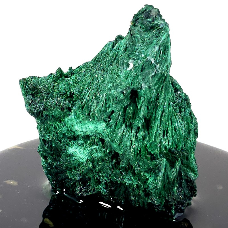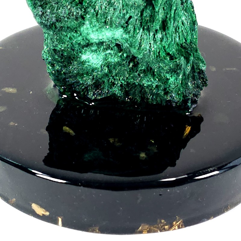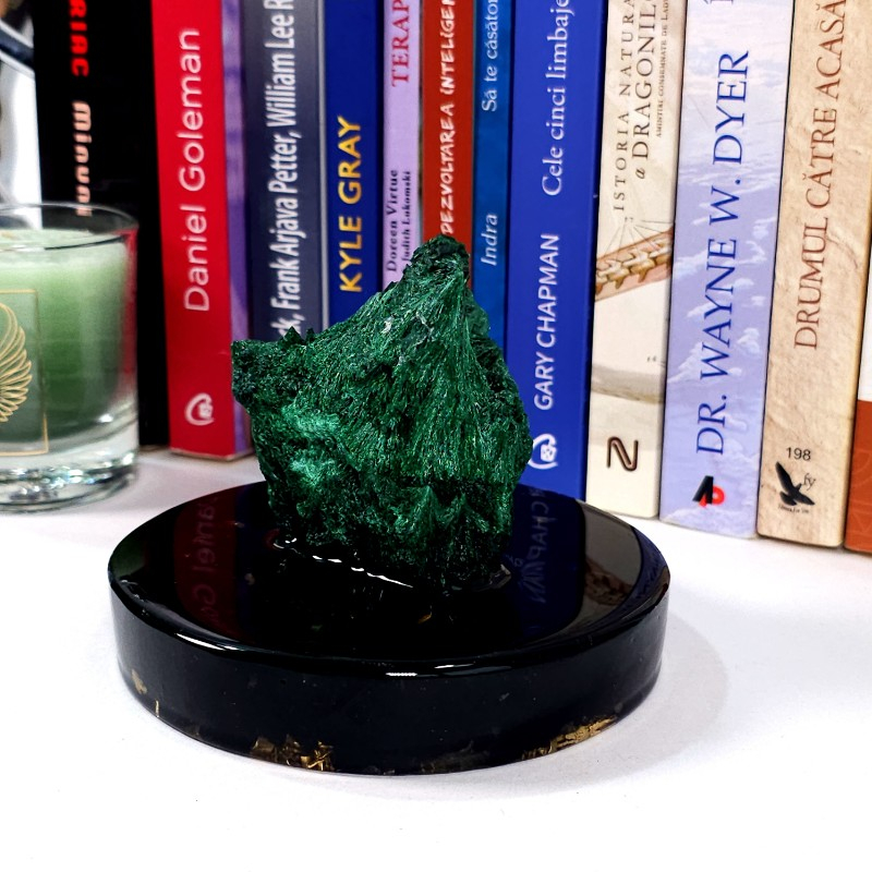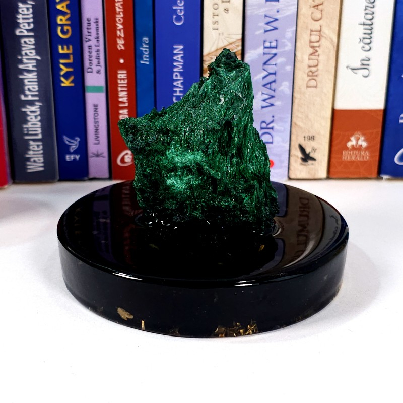 Esantion mineral malachit fibros natural pe suport orgonic din turmalină neagră și cuarț. Obiect de decor pentru casa, birou sau pentru cabinetul de terapie