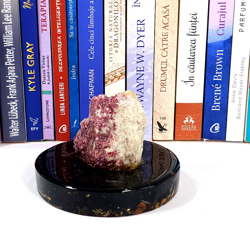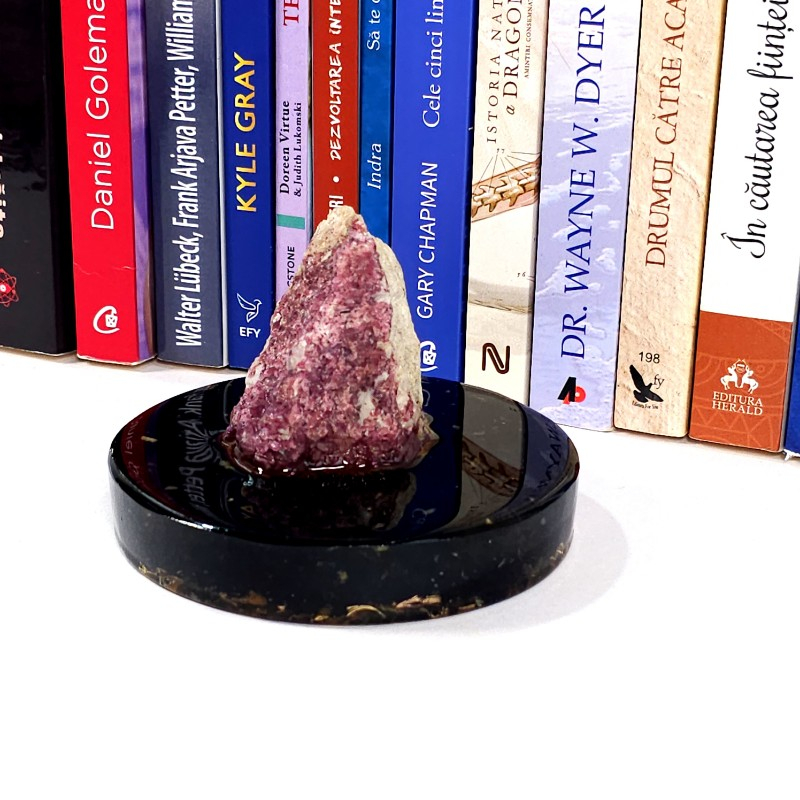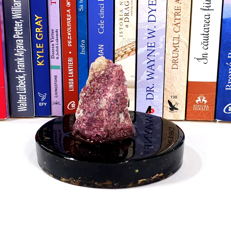 Eșantion mineral din tumalină roz și roșie cu cuarț, pe suport orgonic din turmalină neagră și cuarț. Obiect de decor pentru casă, birou sau pentru cabinetul de terapie.