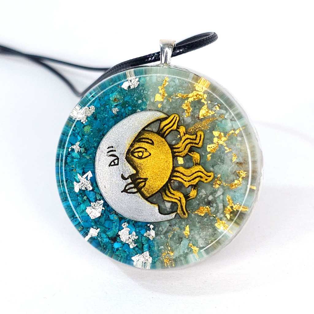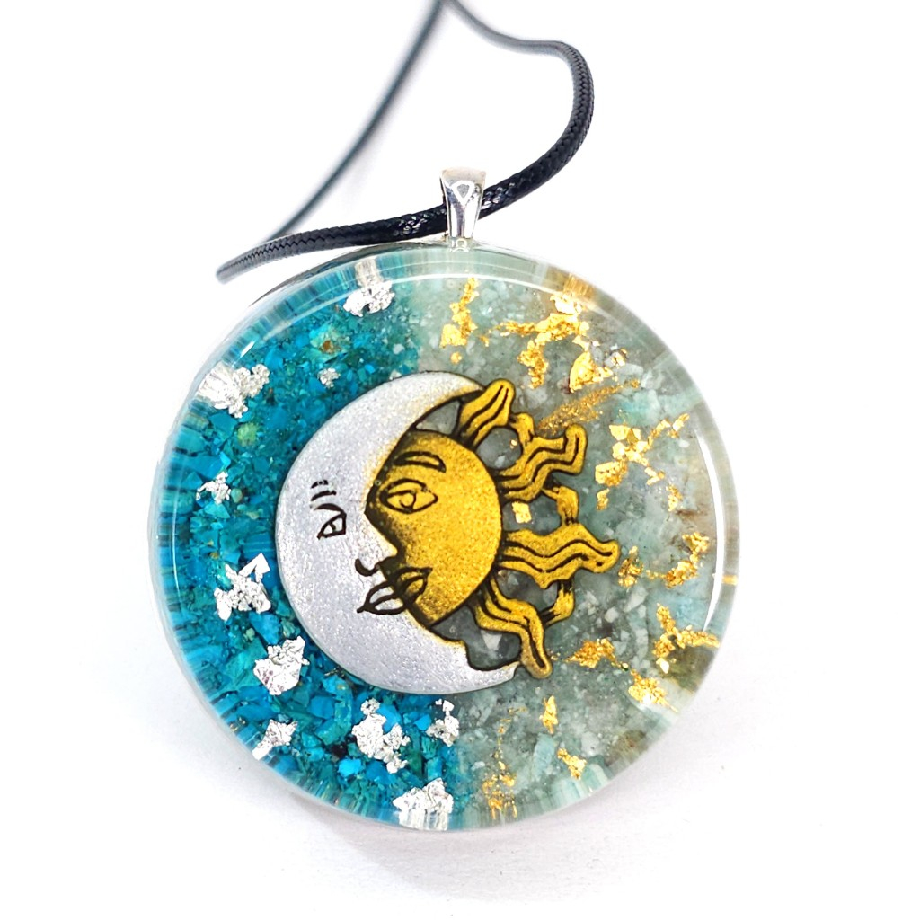 Pandantivul Soare și Lună este realizat din pietre semiprețioase de crisocola, amazonit, fluorit, celestină, citrin, turmalină multicoloră, alături de aur 24K, argint, cupru, alamă, rășină și o reprezentare a lunii și soarelui, al succesiunii noapte-zi, simbol al echilibrului. Noaptea mai reprezintă și timpul gestației, al germinării, al pregătirii iar ziua manifestarea la viață. Luna este yin, iar soarele yang. Soarele rezprezintă cunoasterea intuitivă, imediată; luna, cunoasterea prin reflectare, speculativă.