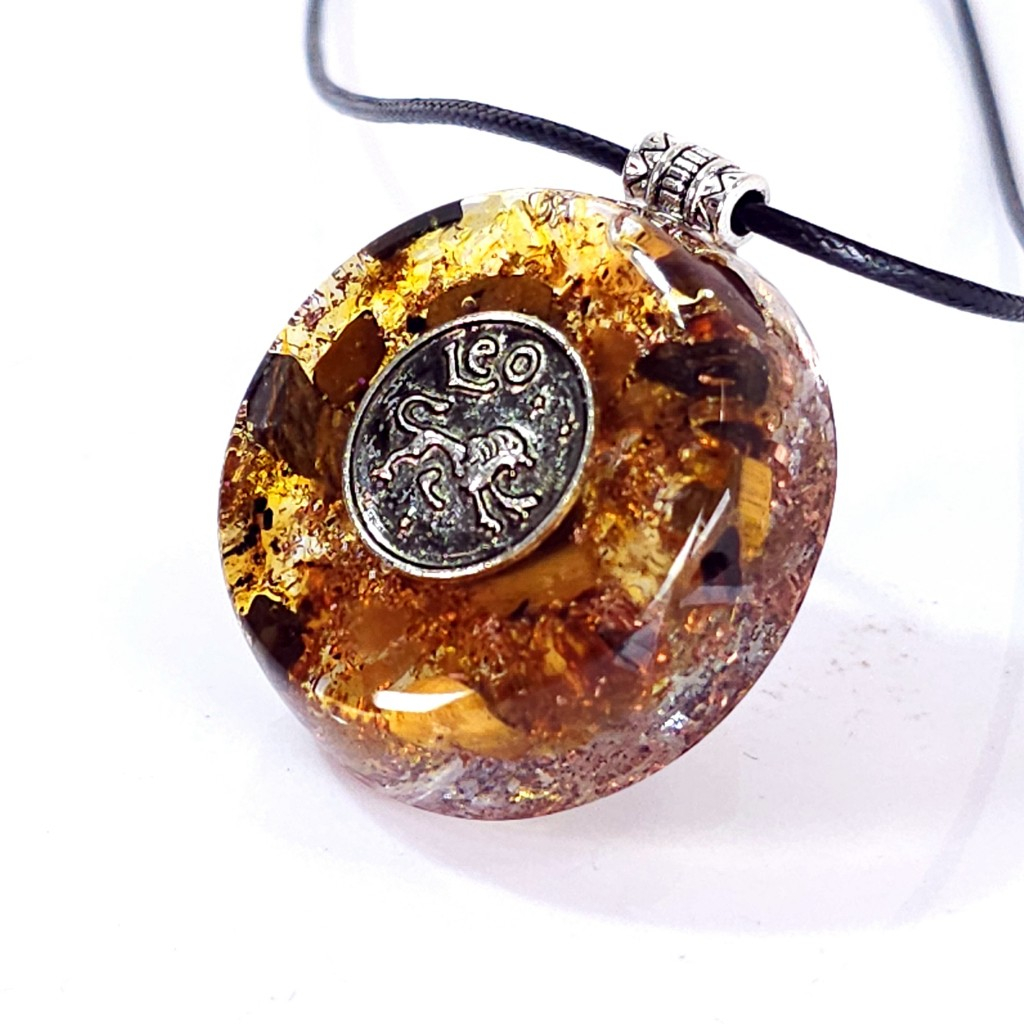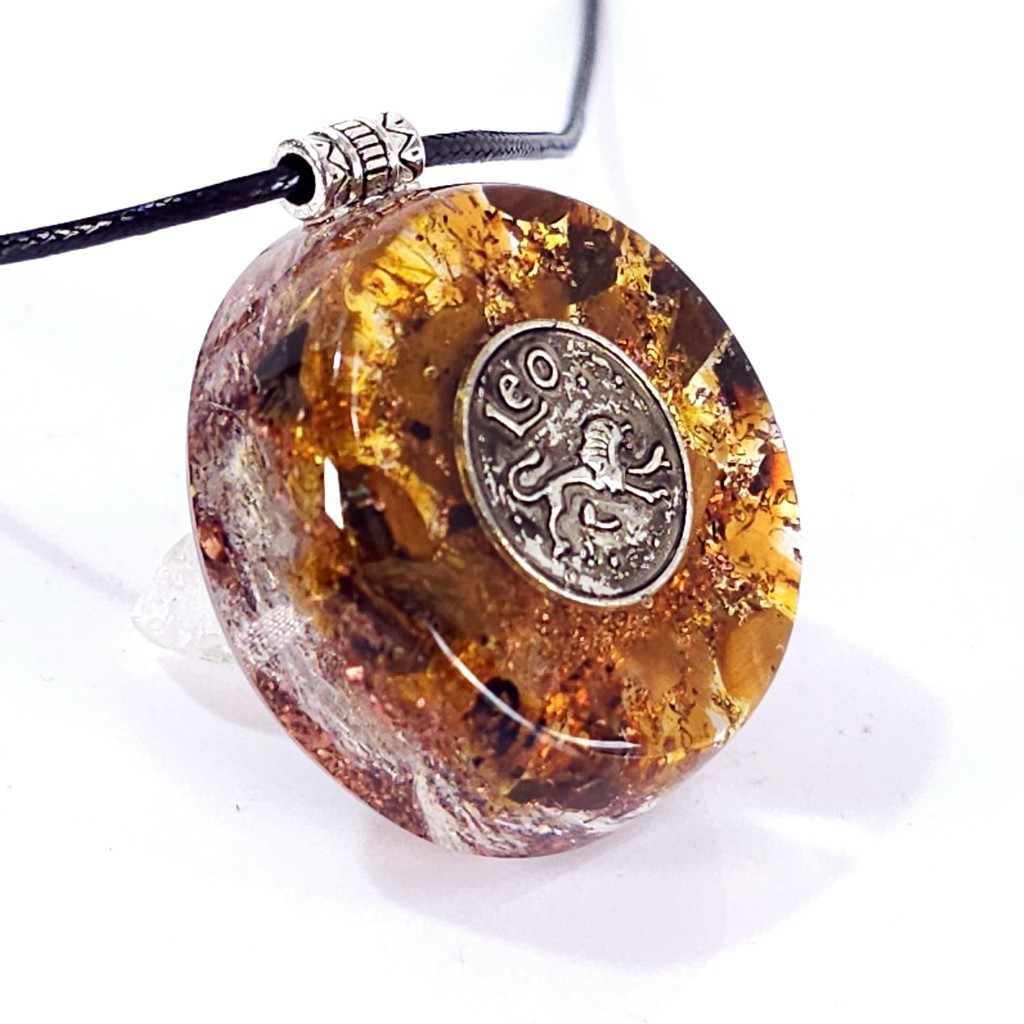 Pentru zodia Leu am conceput un pandantiv orgon pentru care am ales pietrele naturale semiprețioase ce rezonează cu nativii zodiei leu, respectiv: chihlimbar, ochi de tigru, citrin, lepidolit, cuarț.