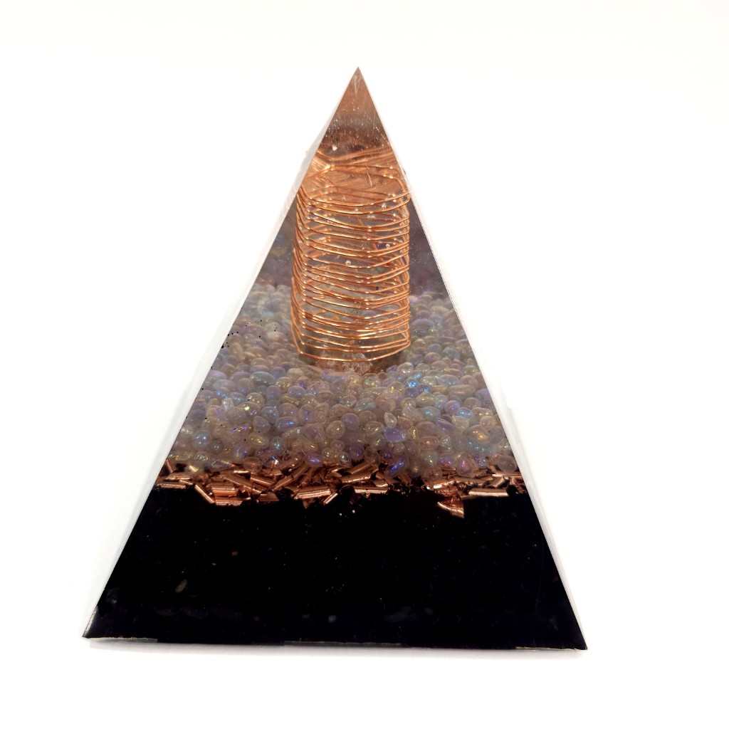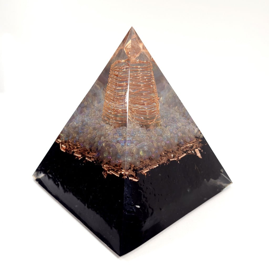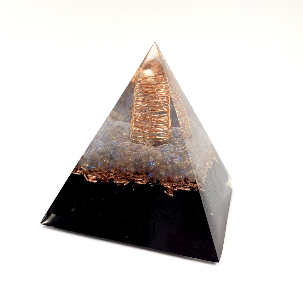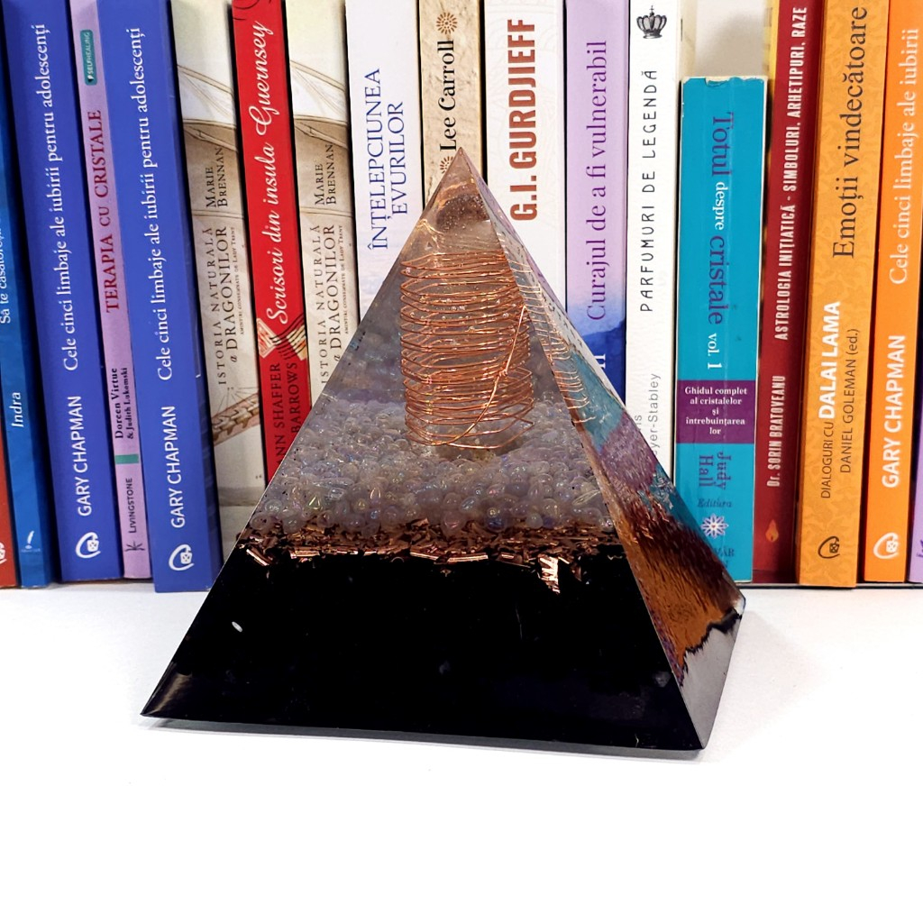 Această piramidă orgon din pietre naturale semiprețioase, îmbină beneficiile cristaloterapiei cu proprietățile de protecție electromagnetică ale orgonului, fiind realizată din: foiță de aur de 24K, baghetă de cuarț cu vârf natural, pietre naturale semiprețioase de cuarț aqua aura, turmalină neagră, obsidian negru, cuarț, cupru, alamă, bronz, rășină. În interiorul piramidei s-a creat din foiță de aur, cristal de cuart cu vârf natural și cristale de cuarț aqua aura, fantoma unei piramide mai mici. Pietrele semiprețioase alese pentru realizarea acestei piramide orgon sunt cunoscute pentru acțiunea lor purificatoare și protectoare.