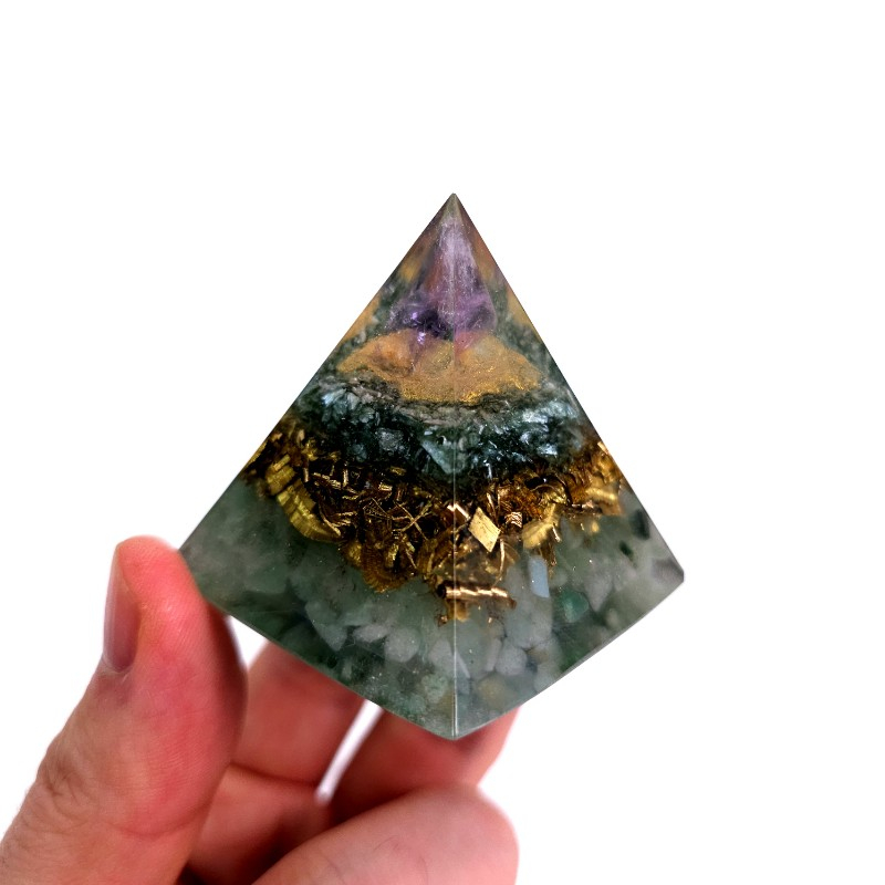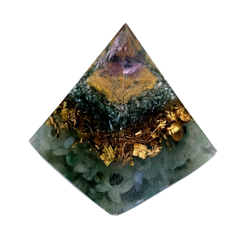 O piramidă orgon realizată din pietre naturale de serafinit, cuarț, aventurin verde și vârf de cristal de ametist, alături de alamă, cupru și rășină. O piramidă orgon discretă ce vă poate fi alături la masa de lucru, la birou, pe noptieră.