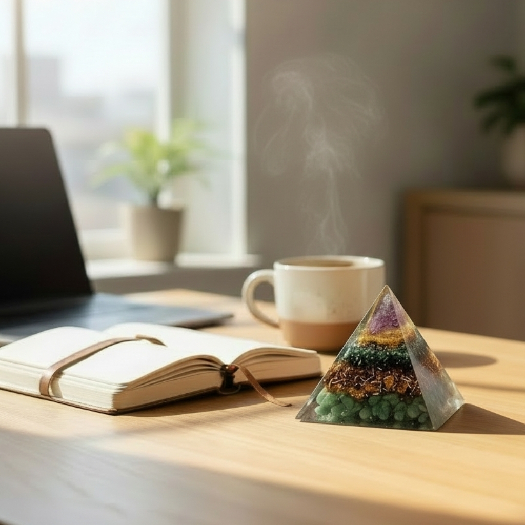 Piramidă orgon realizată în România, din pietre naturale cunoscute pentru capacitatea lor cristaloterapeutică de a susține bunăstarea emoțională și spirituală.