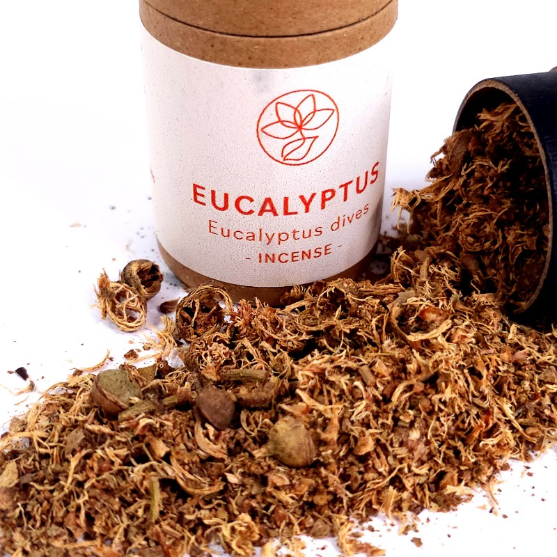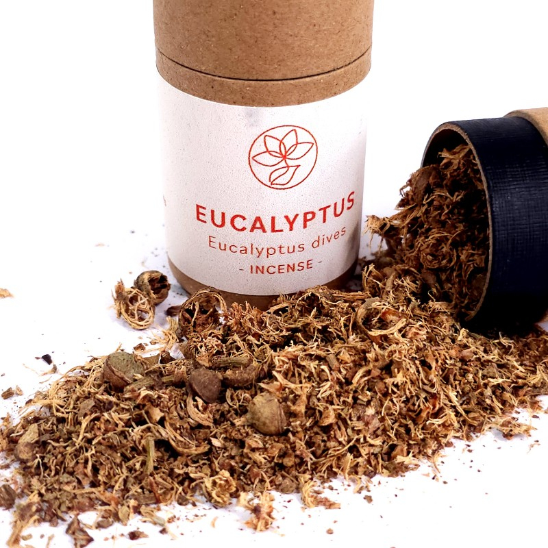 Cutie din carton cu capacitatea de 30 ml, conținând aprox. 8 g frunze și scoarță uscate de eucalipt pentru fumigații.